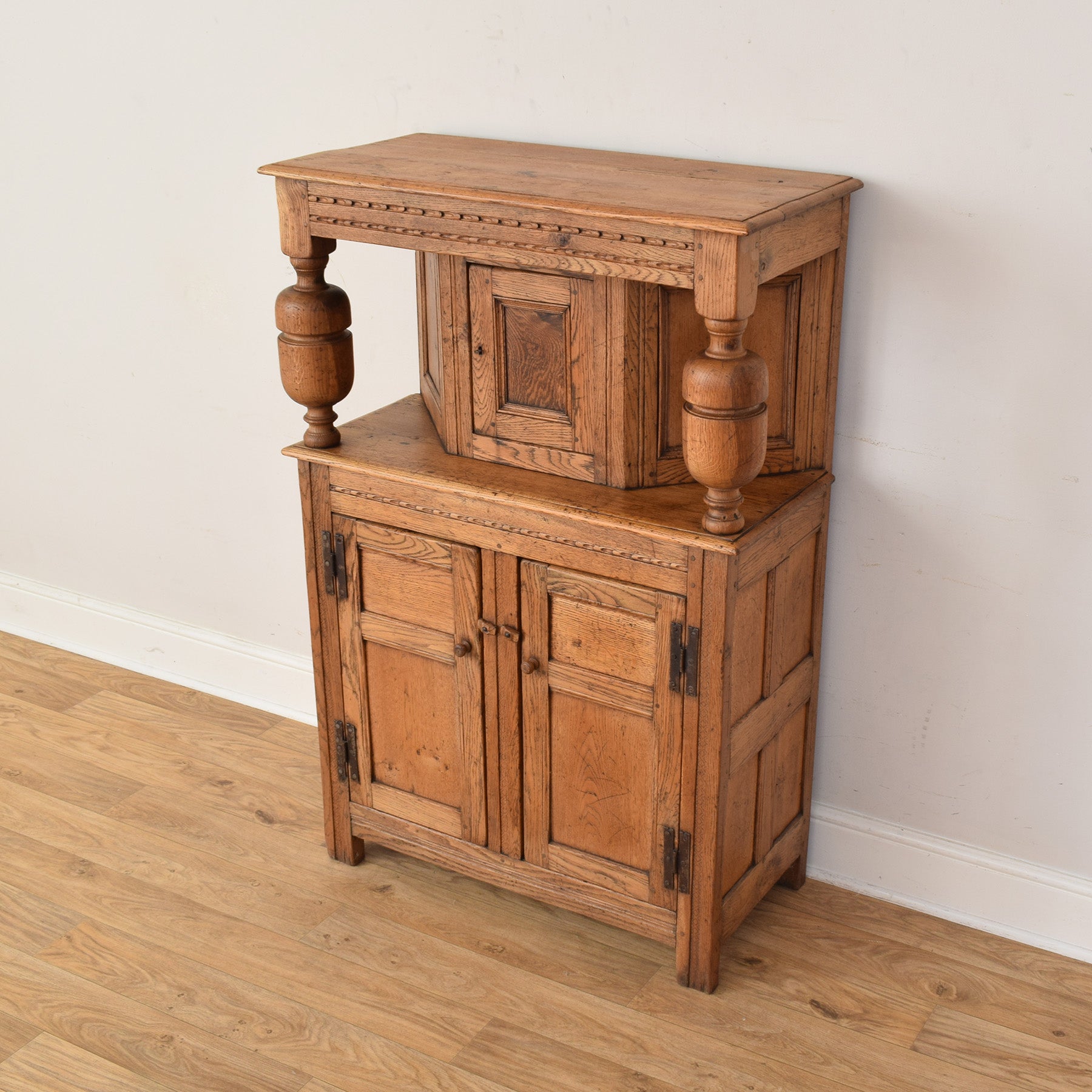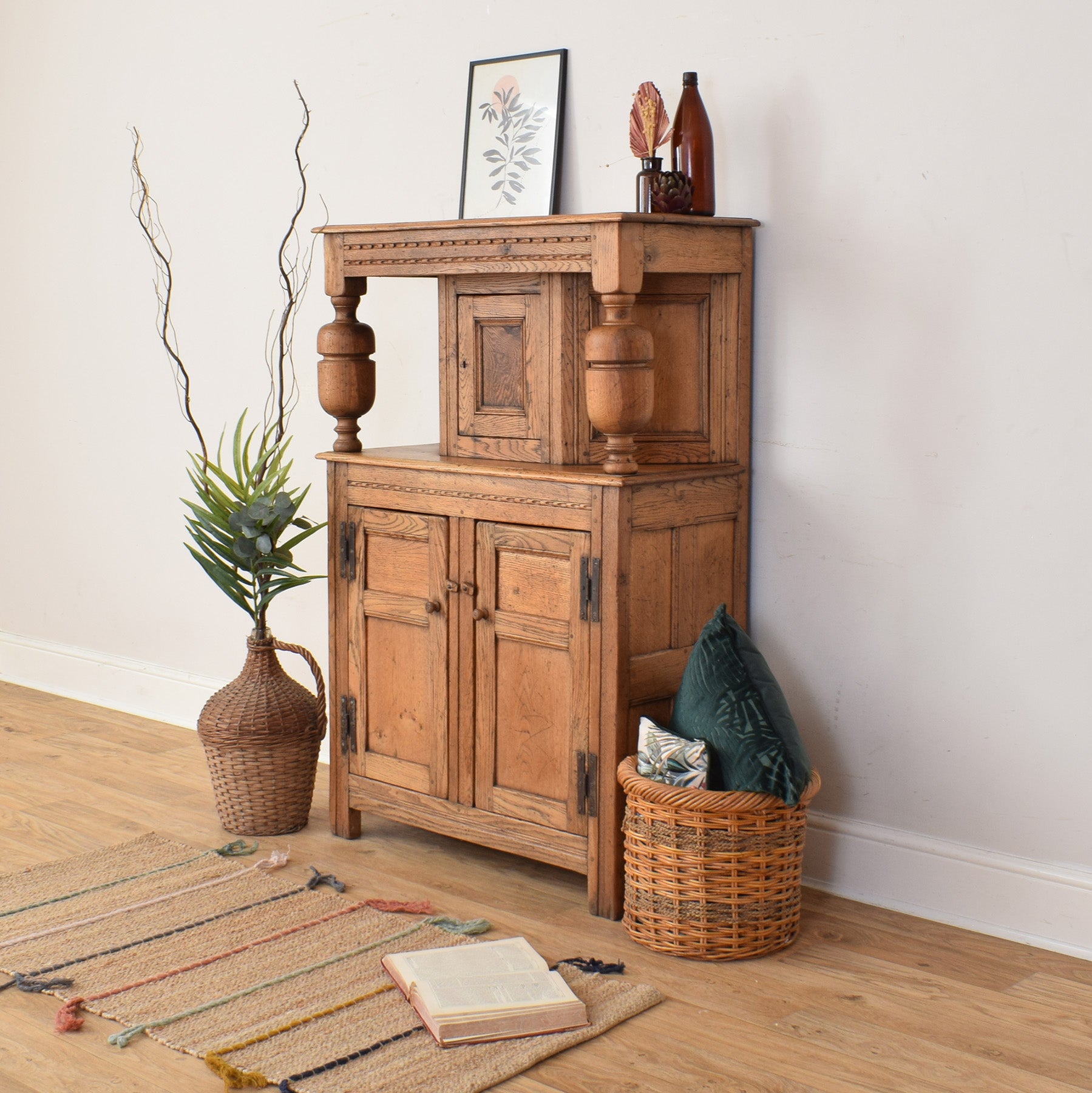 This oak court cabinet would sit comfortably in a dining room, kitchen, or hallway, offering practical storage while adding warmth and character to the space. Its traditional form and natural timber tones help create a settled, welcoming atmosphere that works well in both period and country-style interiors.