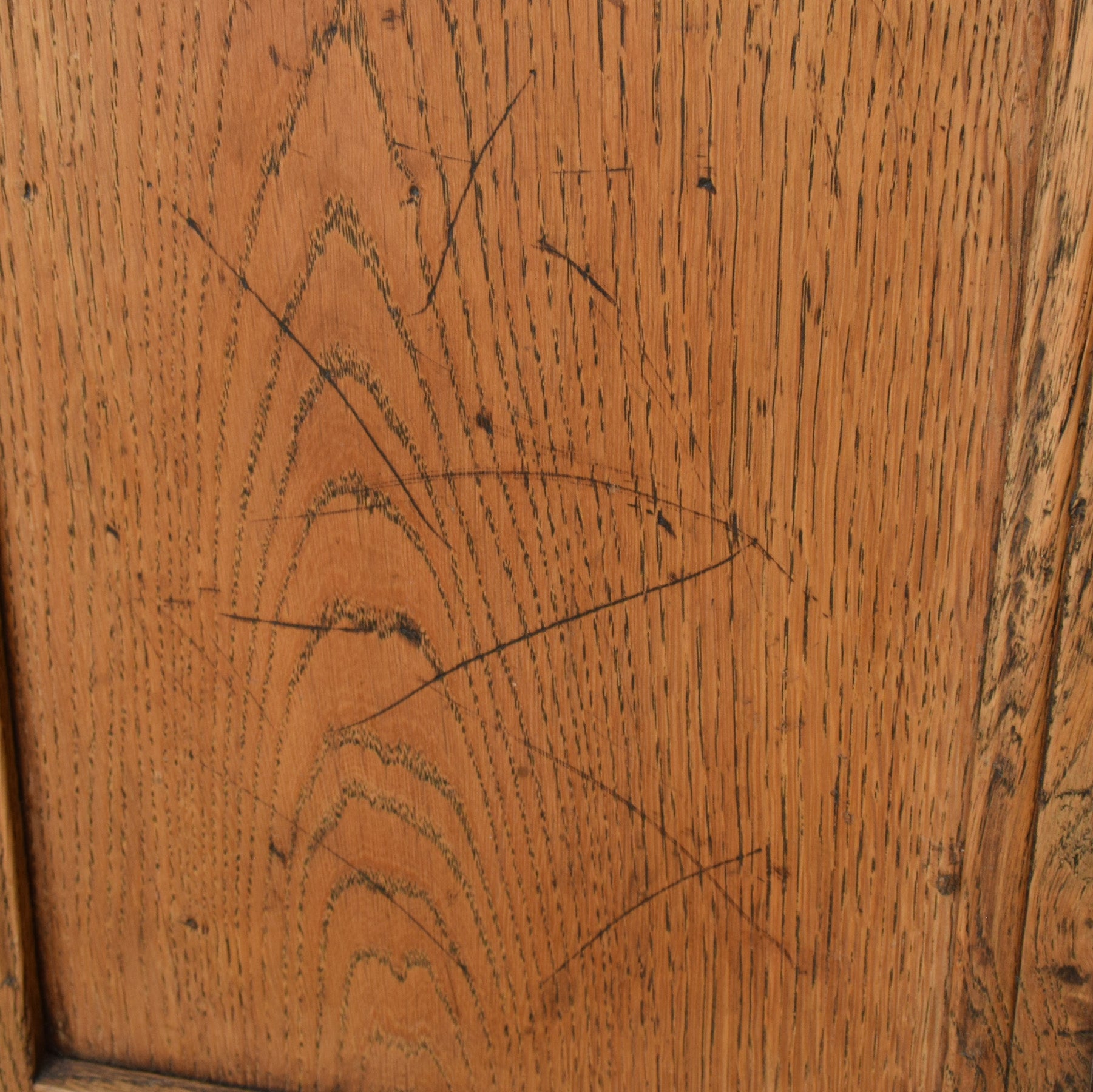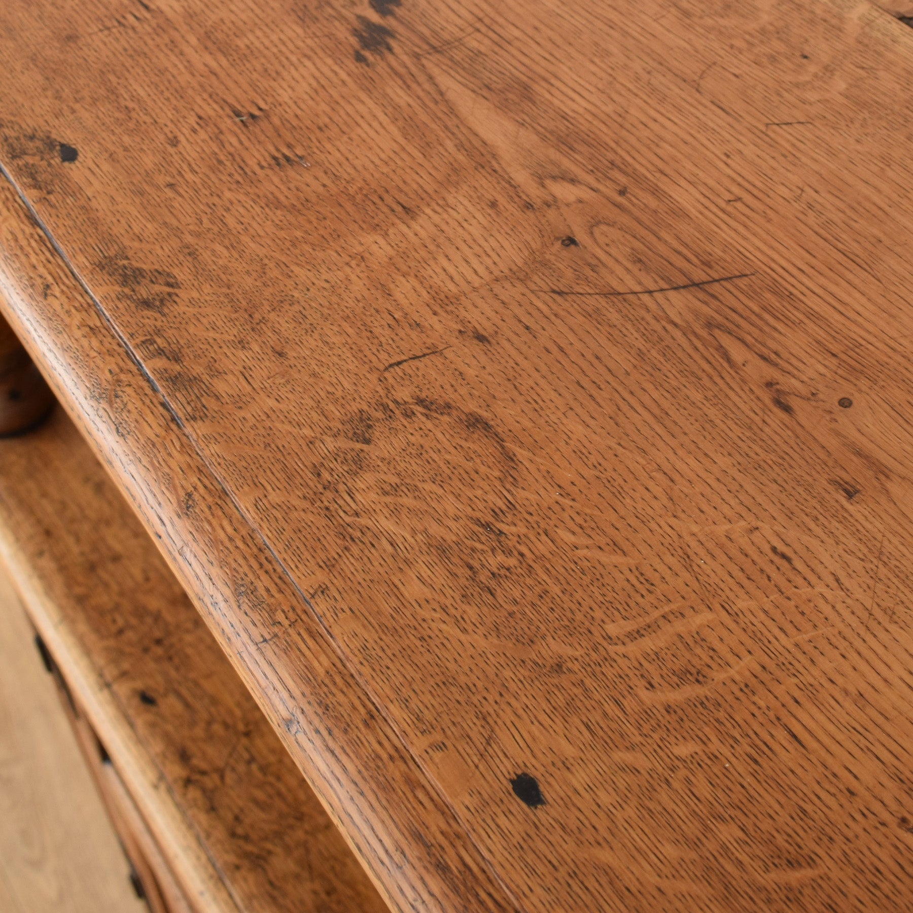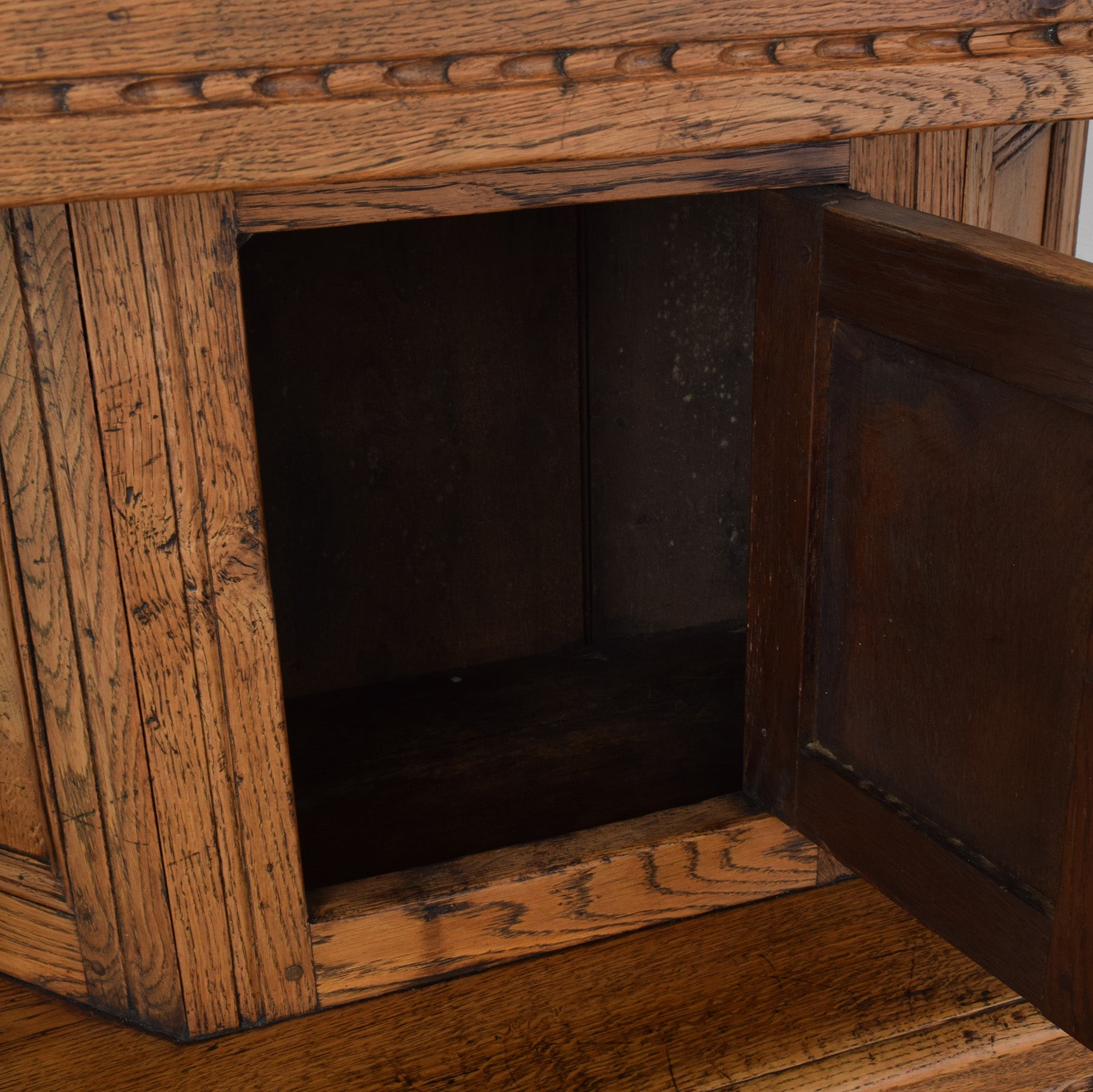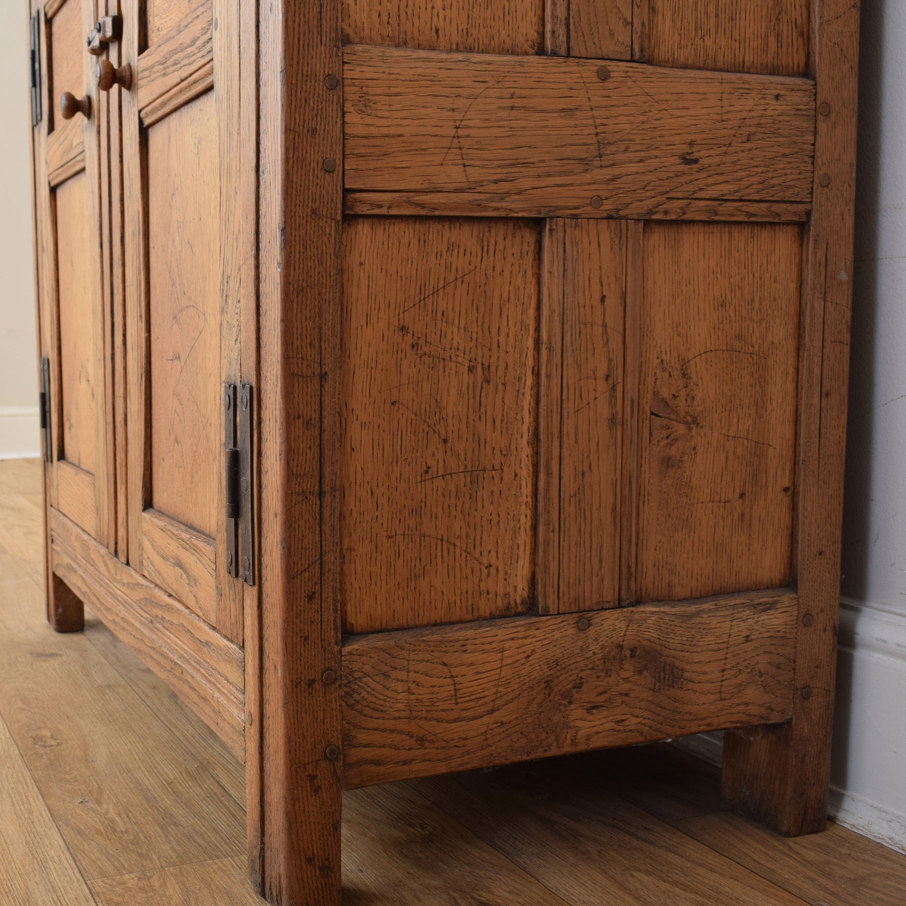 The previous darker finish has been stripped, and multiple coats of hard-wearing matte lacquer have been applied, providing a durable long-lasting finish while accentuating the natural oak grain. As expected with a piece of this age, there are age-related marks, scratches, and scuffs across the cabinet, all of which are visible in the photographs and reflect its history and use. This item is made entirely from solid oak.
