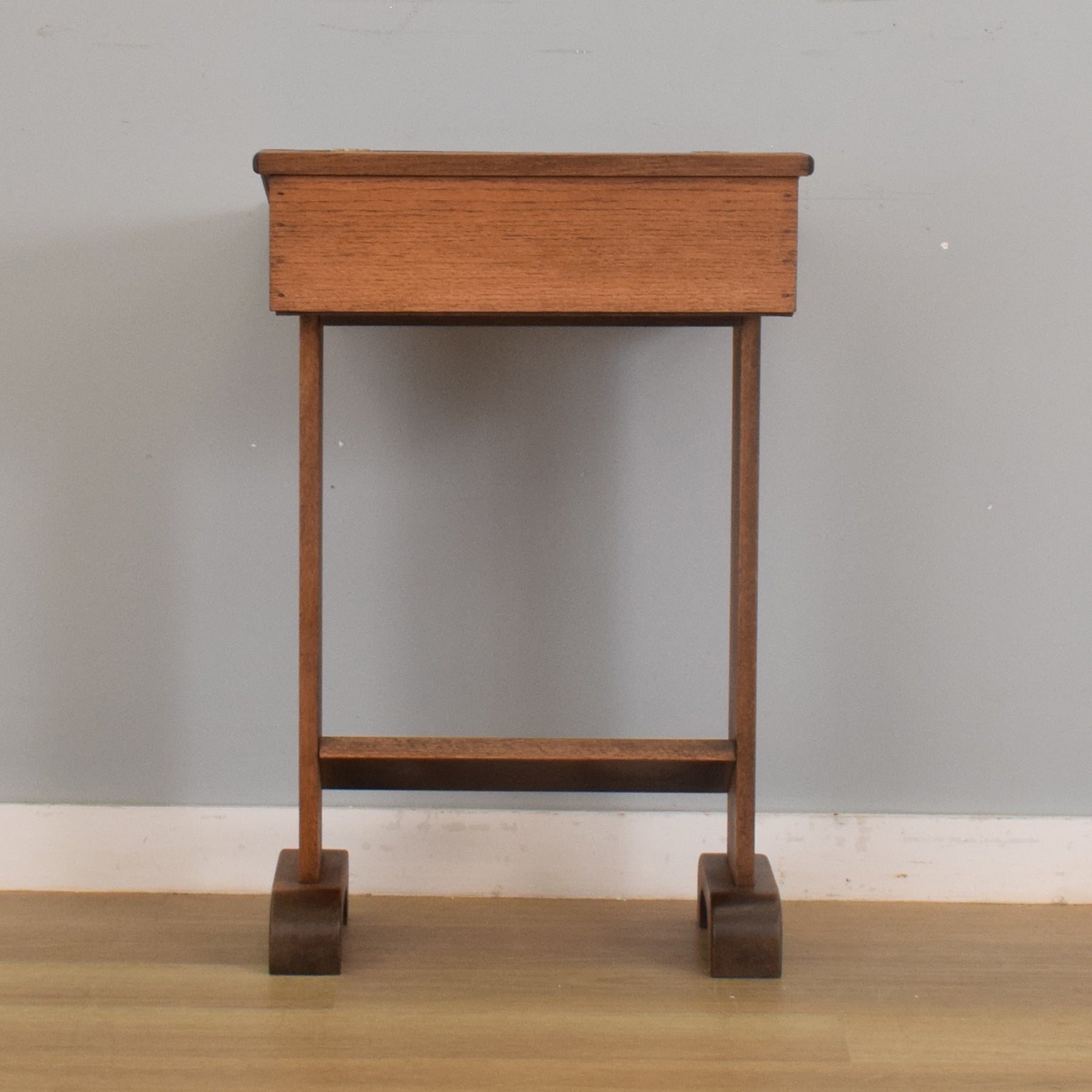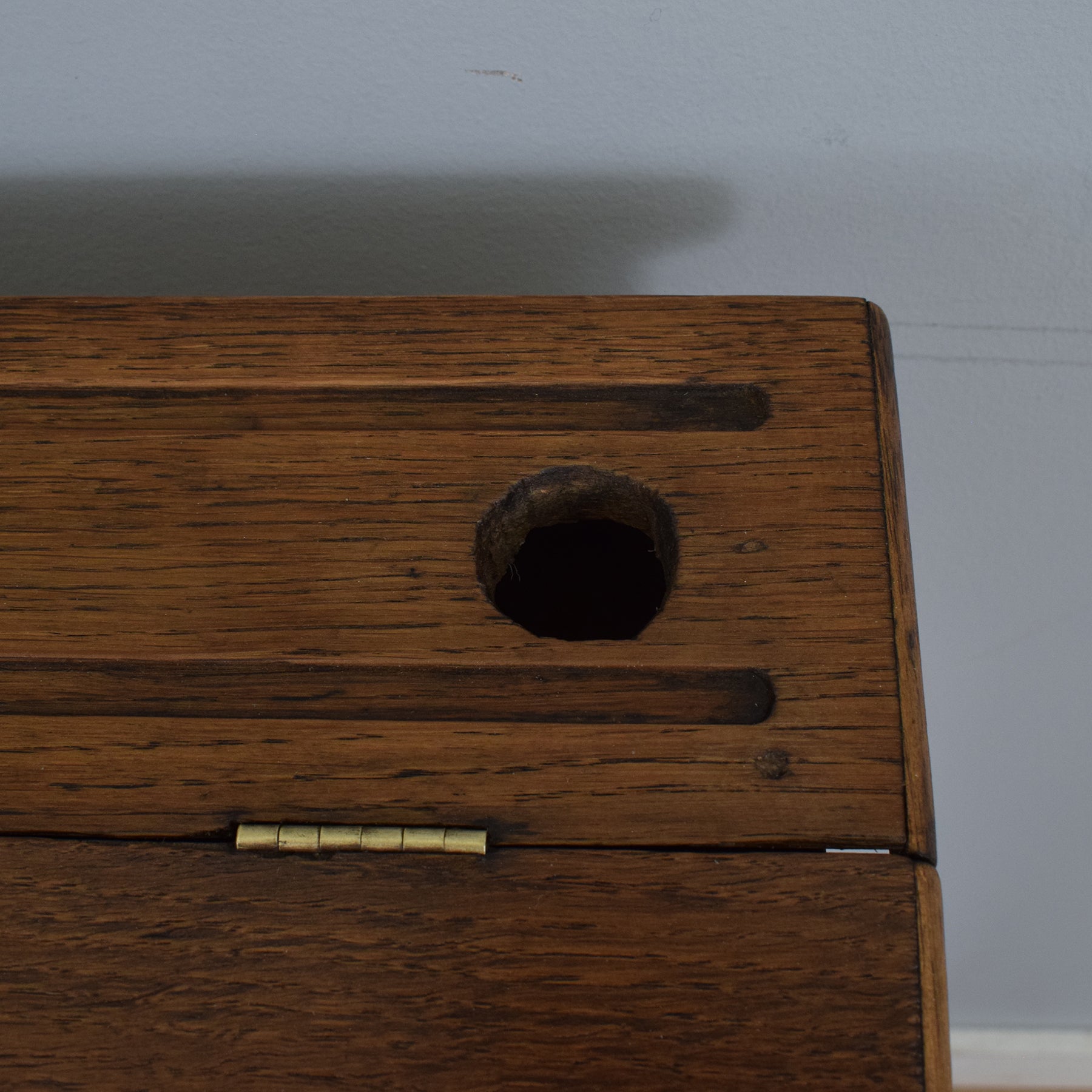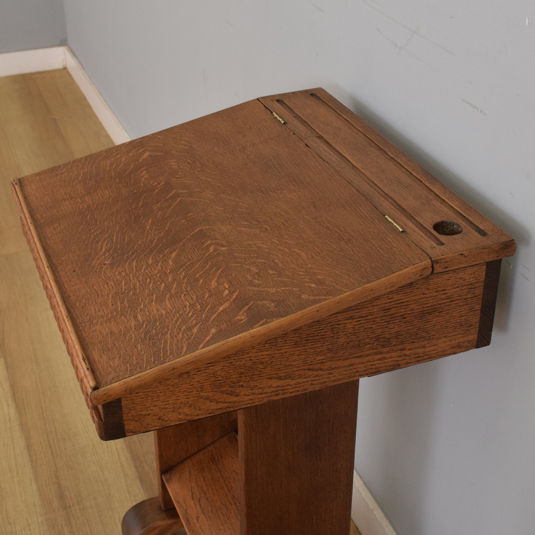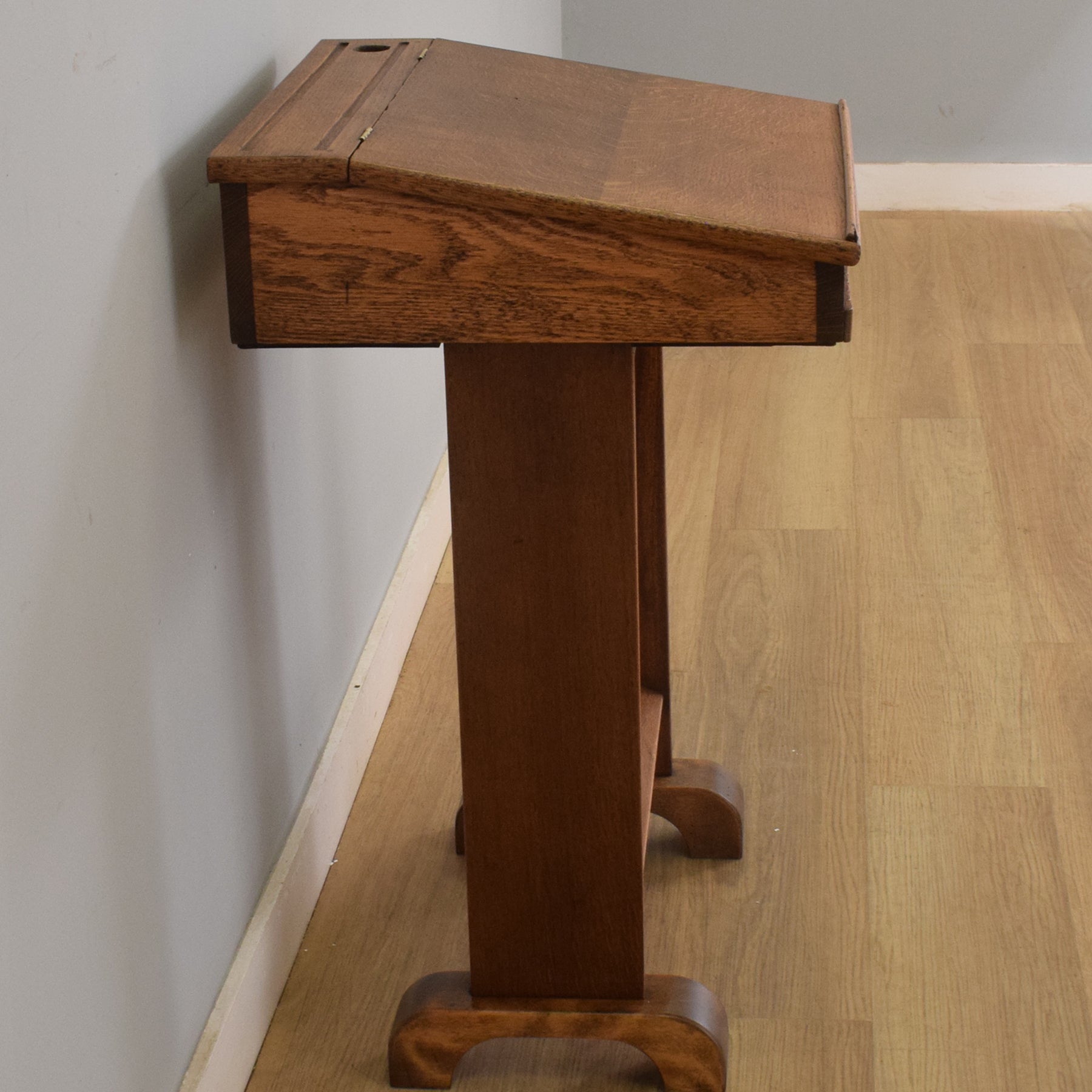 This traditional school desk features a sloped lift-up lid with a spacious internal compartment, perfect for keeping stationery, books, or small items neatly tucked away. A distinctive carved detail runs along the front edge, and the top retains its original inkwell hole. The curved feet and central lower shelf add balance and extra functionality to the piece.