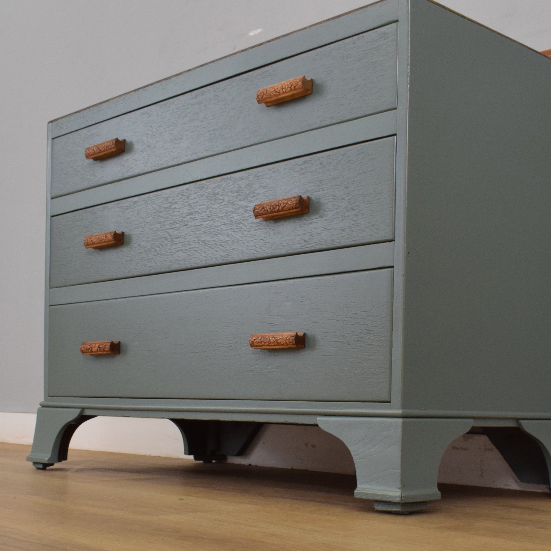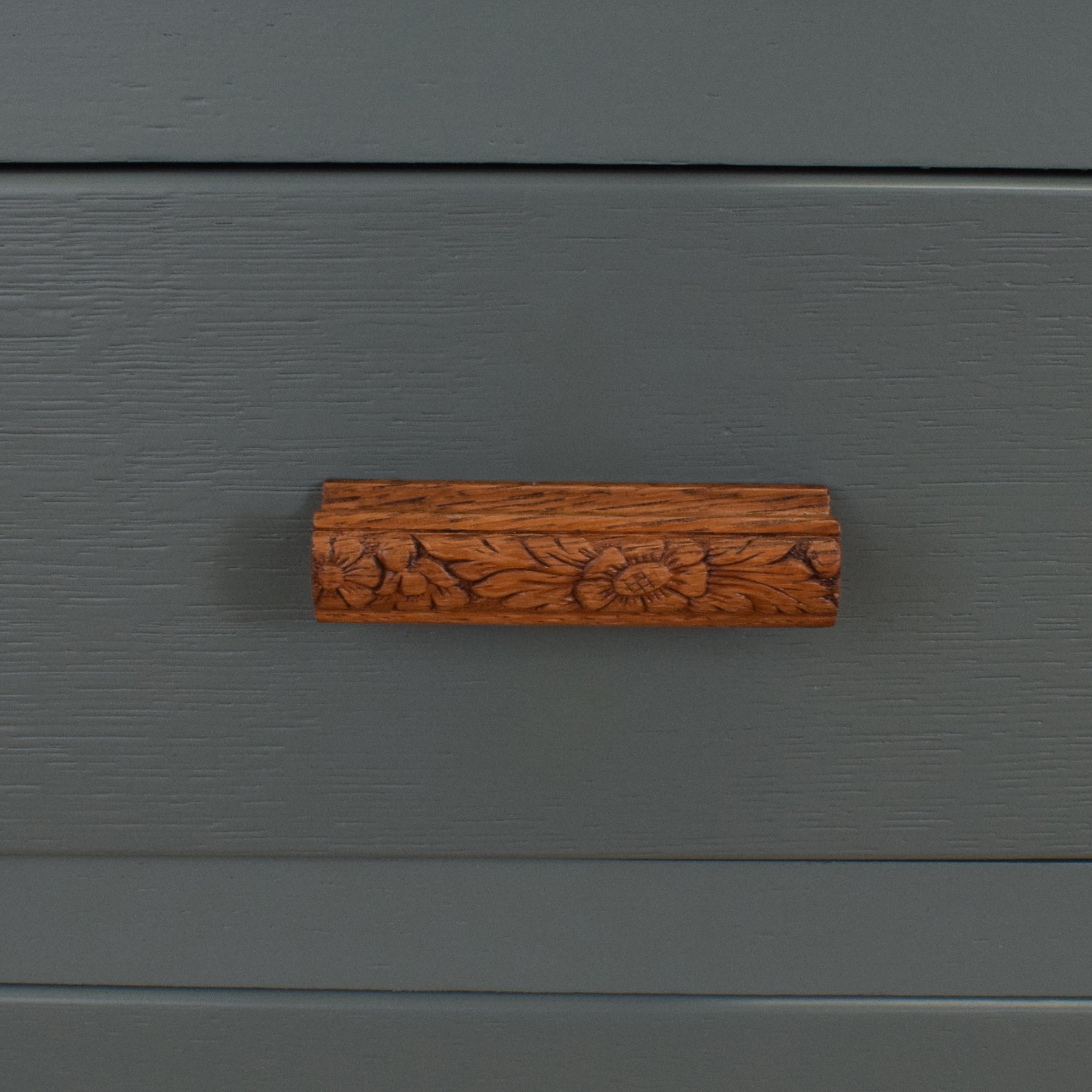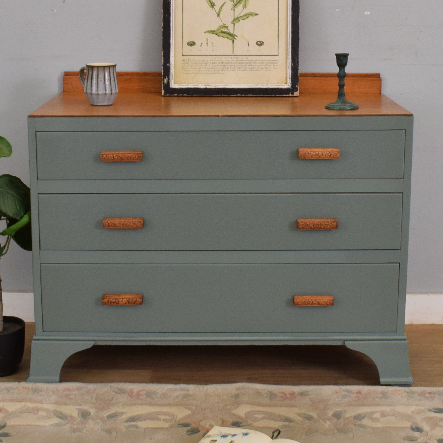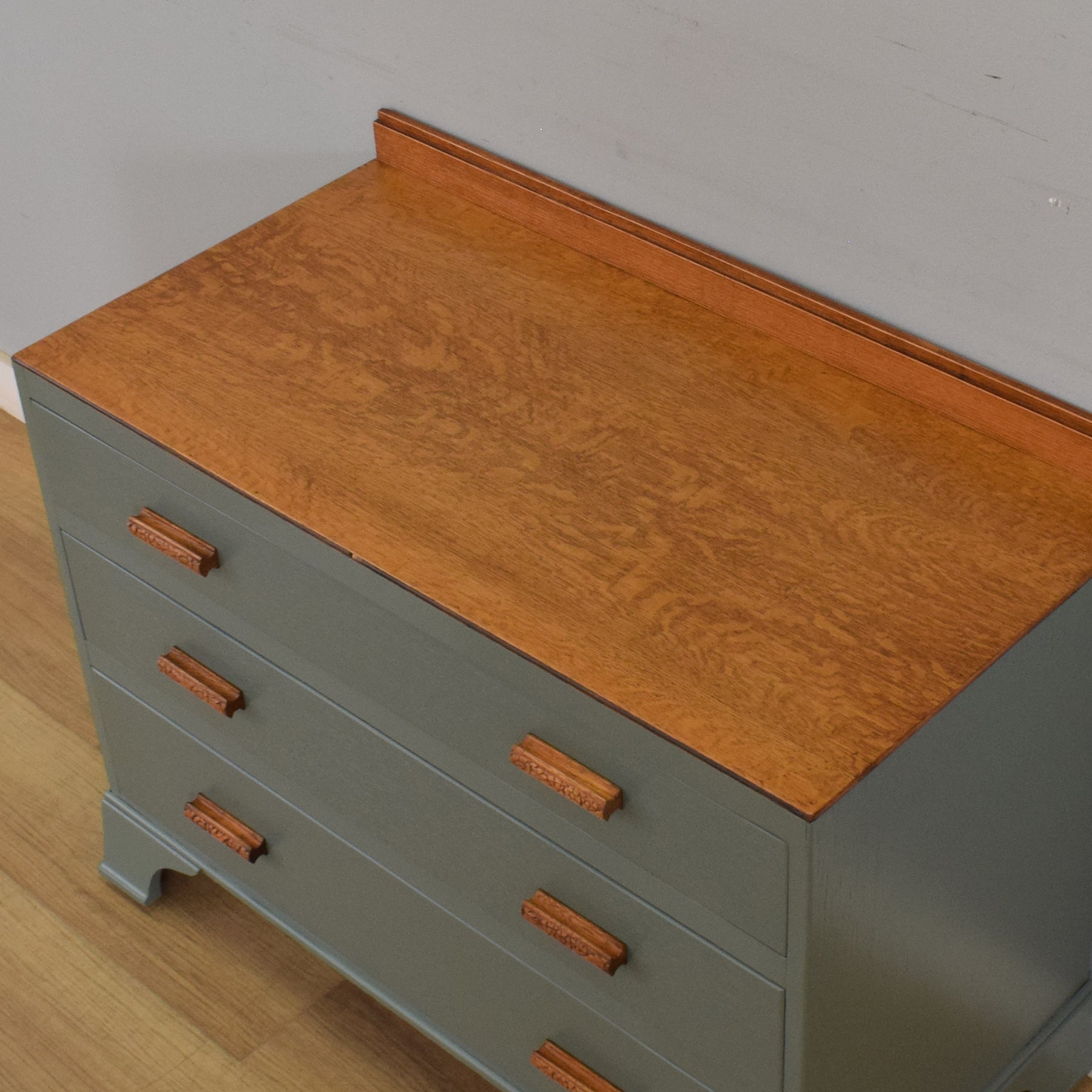 This piece features three full-width drawers with carved wooden handles, set against a painted base in a soft, muted green tone. The simple plinth feet and raised back edge add subtle period-inspired detailing, while the contrast between the painted surface and the rich wood grain of the top and handles brings visual warmth. The oak veneer top displays attractive natural figuring, complementing the floral motif on the handles.