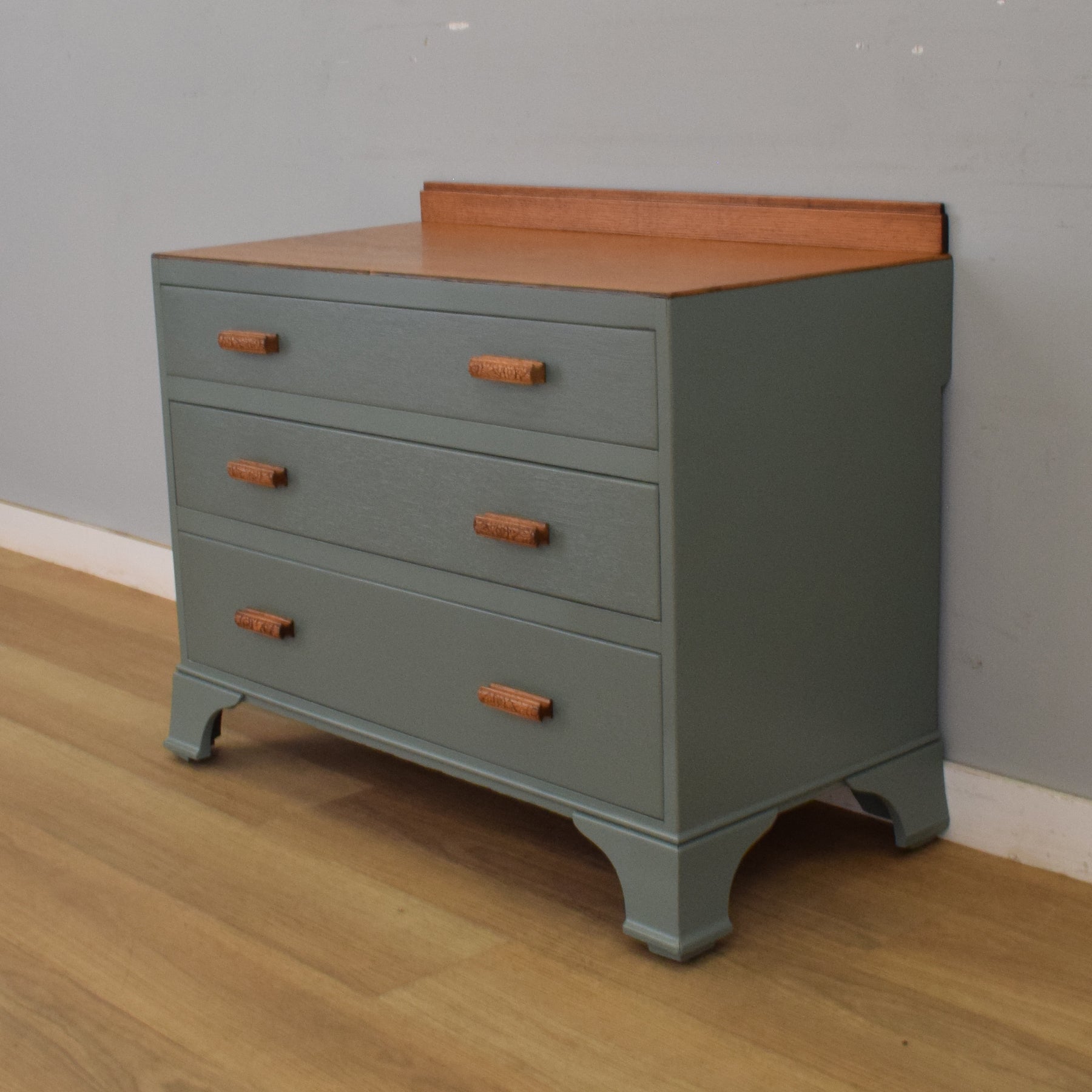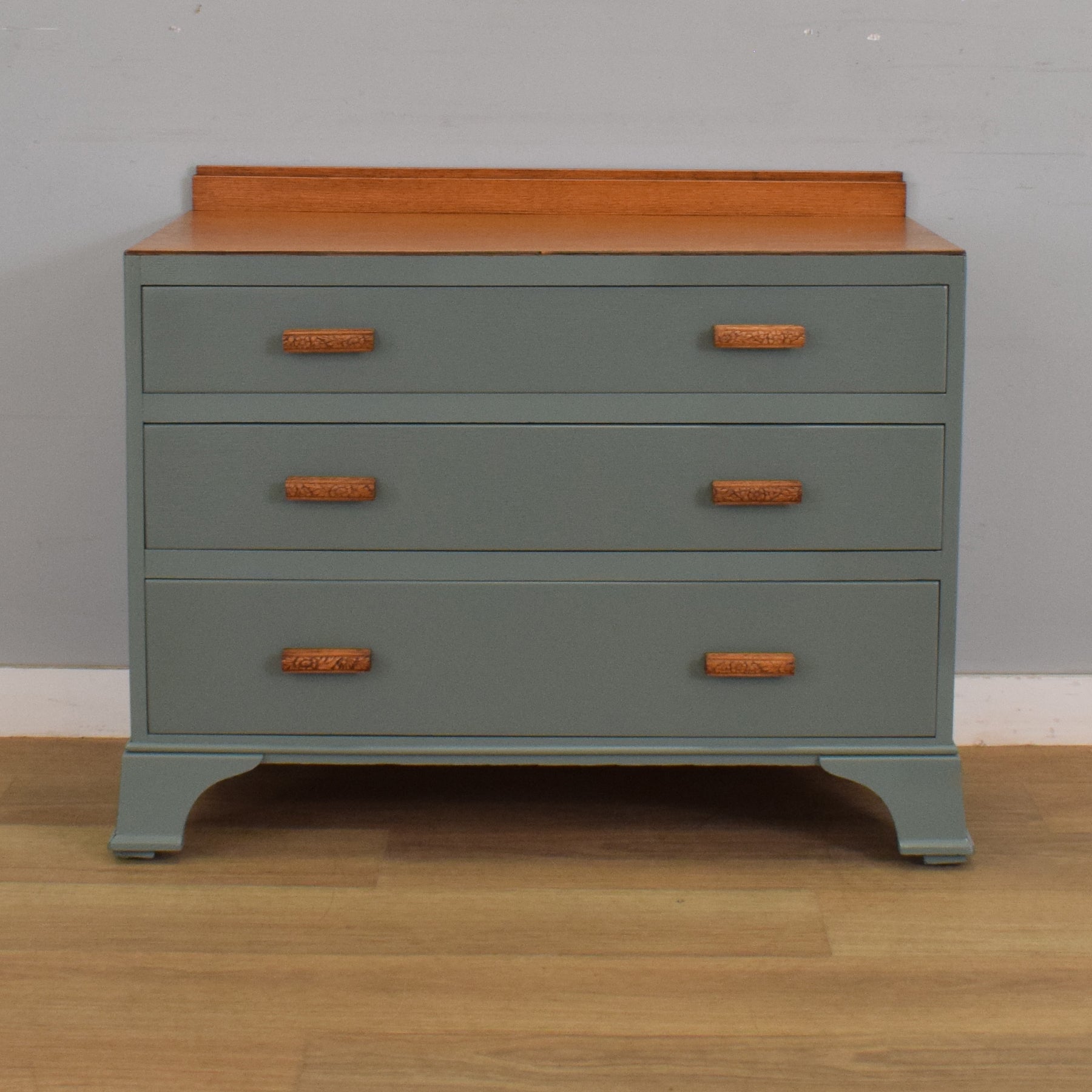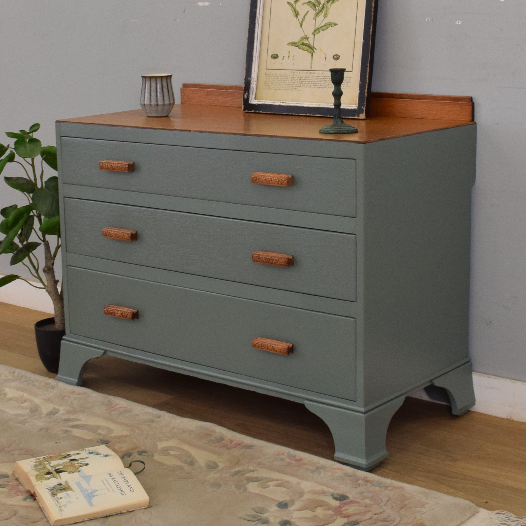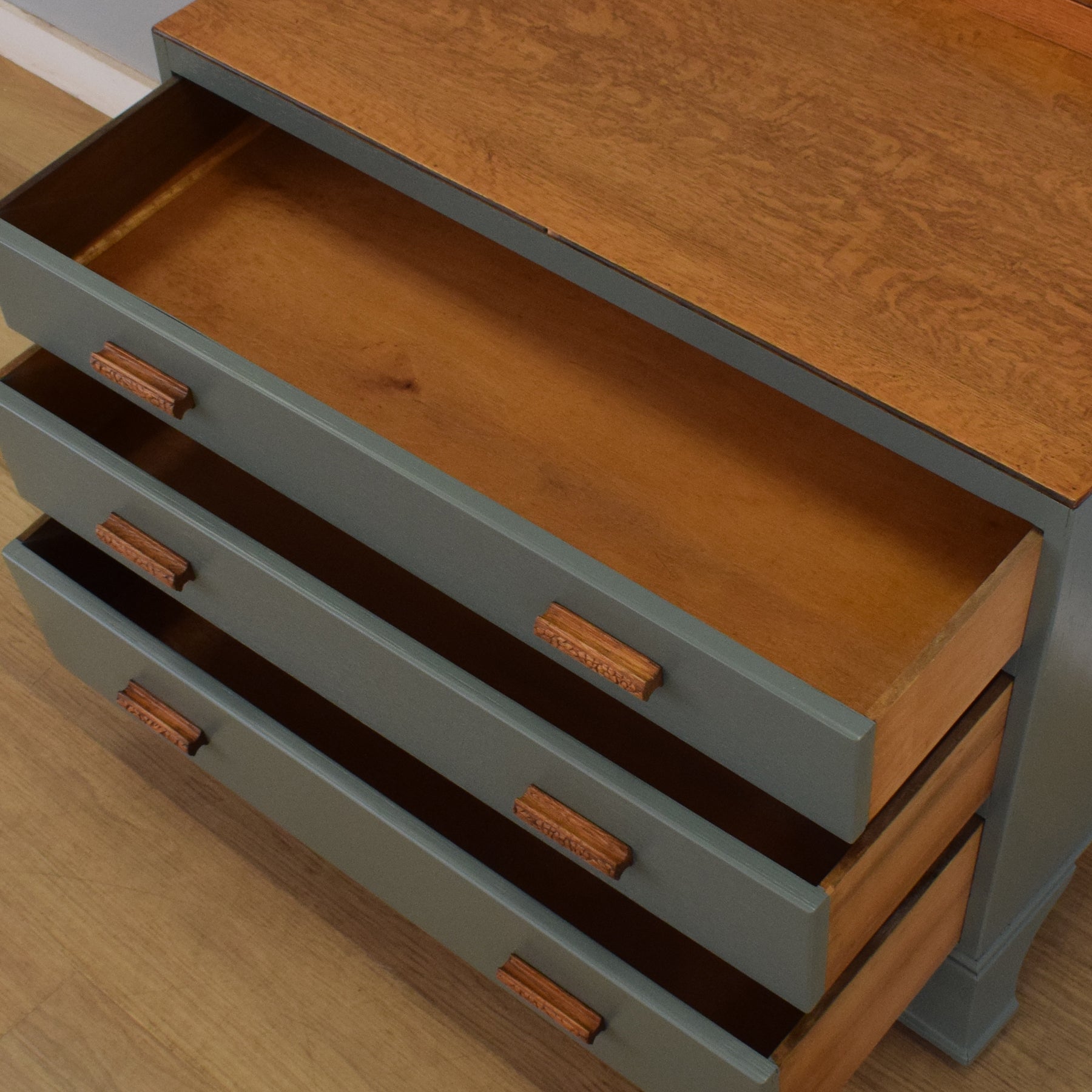 This piece features three full-width drawers with carved wooden handles, set against a painted base in a soft, muted green tone. The simple plinth feet and raised back edge add subtle period-inspired detailing, while the contrast between the painted surface and the rich wood grain of the top and handles brings visual warmth. The oak veneer top displays attractive natural figuring, complementing the floral motif on the handles.