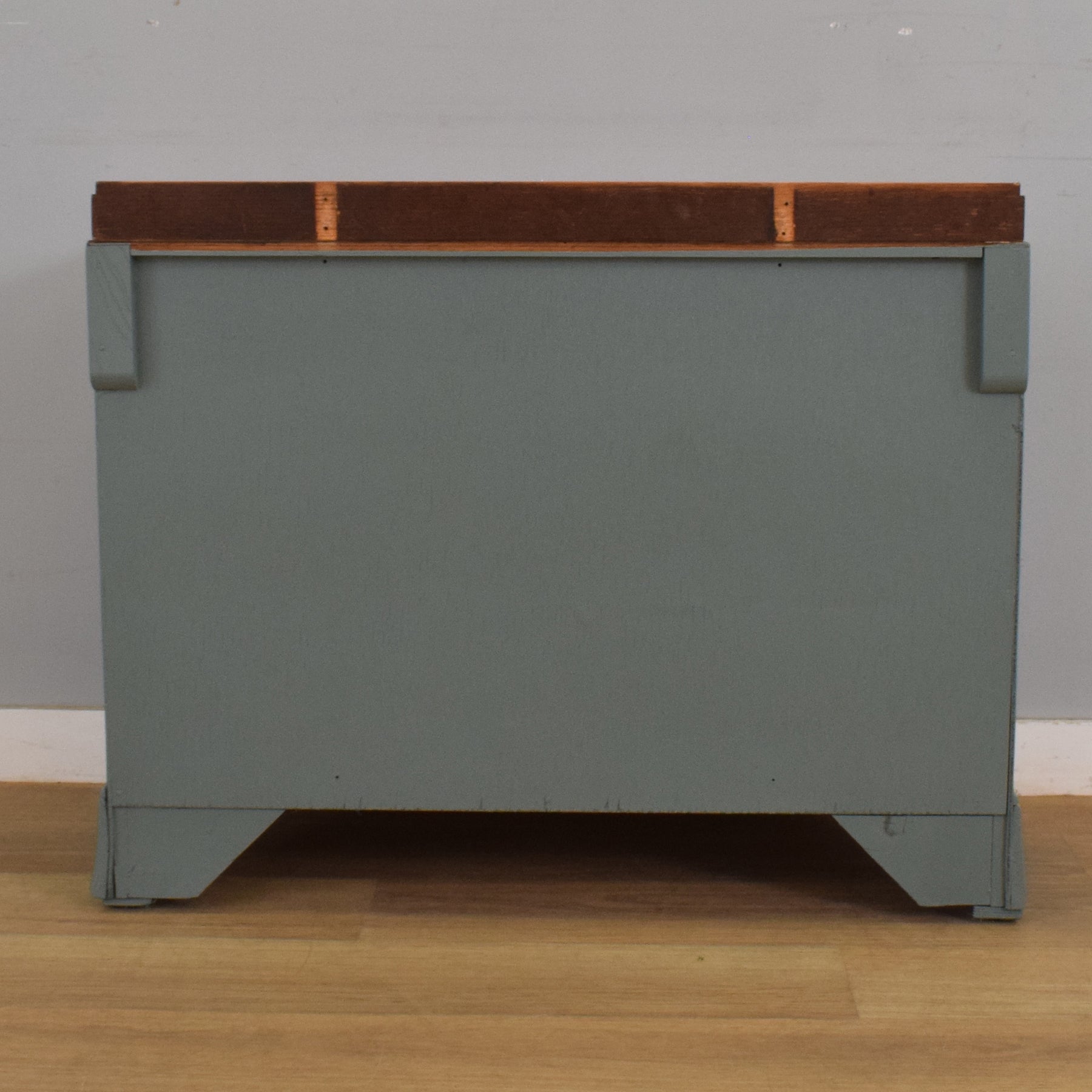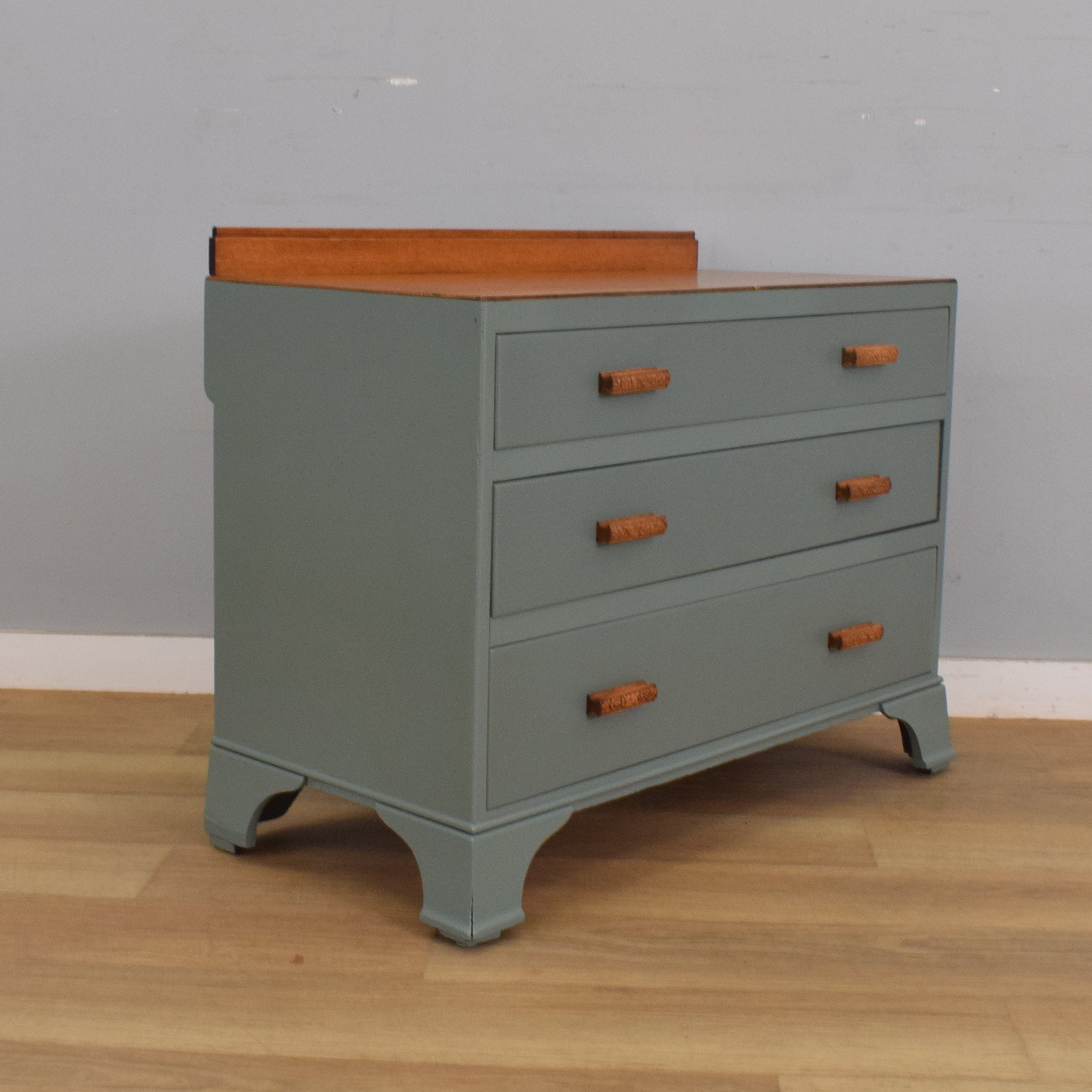 The item has been hand-sanded, cleaned, and finished with multiple coats of durable spray paint in a muted green, offering a fresh, contemporary feel that highlights the oak detailing. The top and handles have been stripped and refinished, with a clear lacquer, to enhance their natural grain and provide a hard-wearing surface. This item is made from oak veneer, with the drawer bases constructed from plywood.