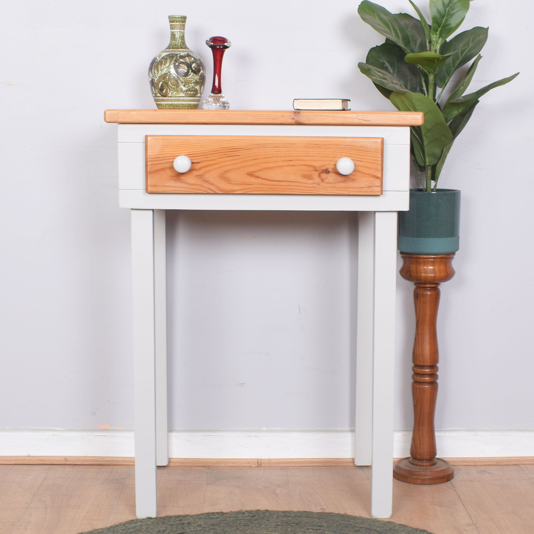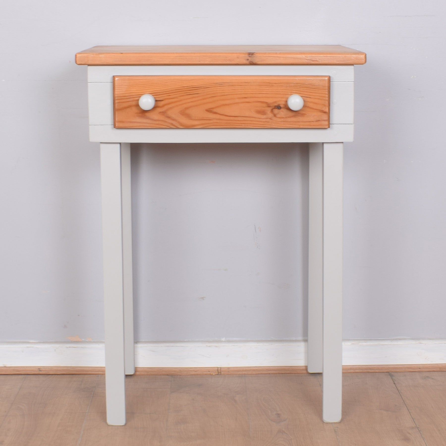 The naturally knotted and grained pine top surface has space for a vase of fresh flowers along with treasured ornaments or family photographs. Below is a useful shallow drawer that is ideal for such items as keys, phone chargers or notebooks and pens. This sits on an elegant painted leg frame.