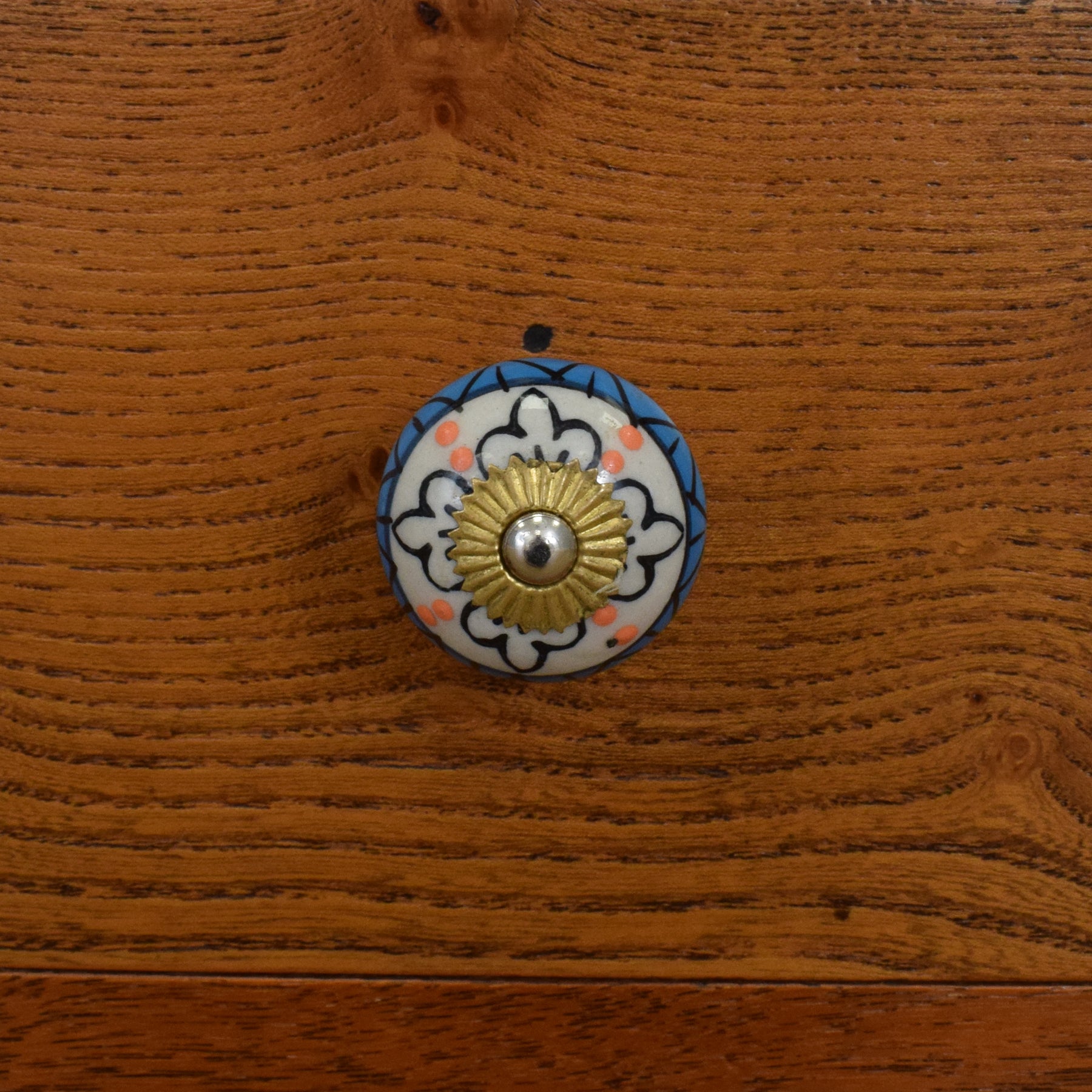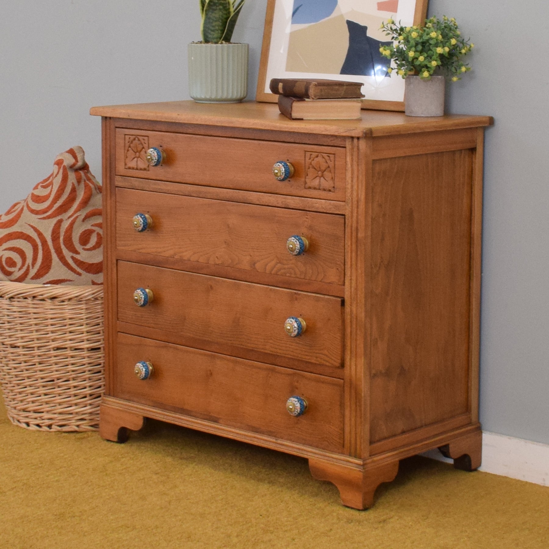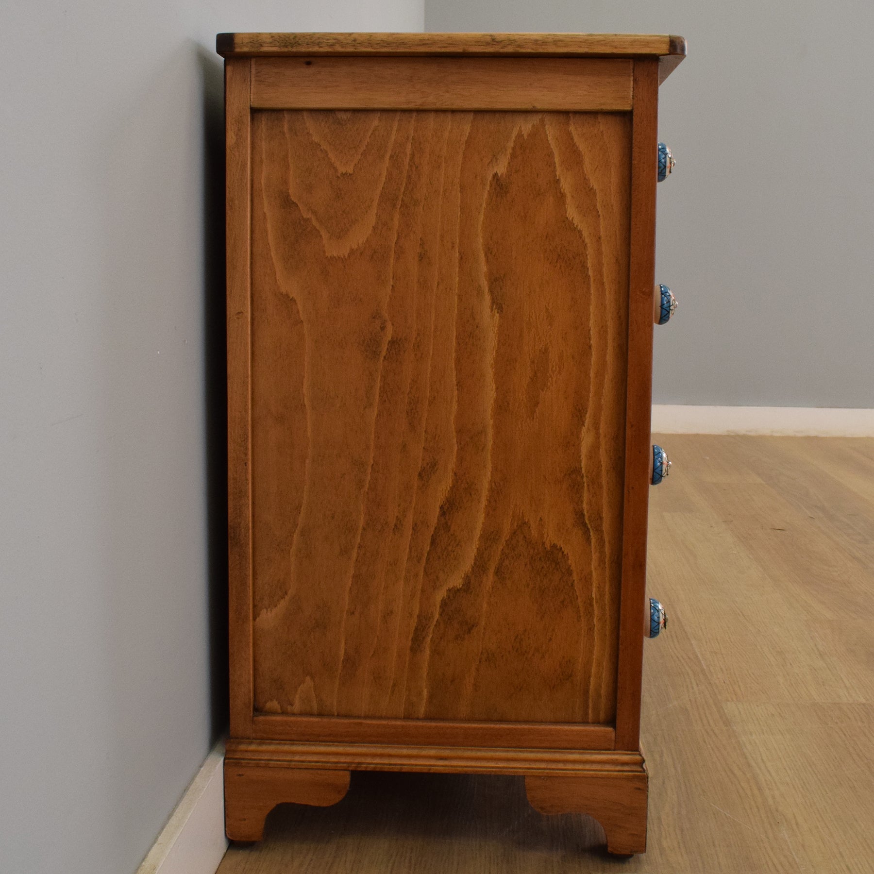 This four-drawer chest features a classic design with subtle decorative carvings on the top corners, bracket feet, and a rich, medium oak tone that enhances its character. Each drawer is fitted with ceramic knobs in blue and cream tones, adding a touch of personality and charm. The drawers are deep and smoothly sliding, ideal for storing clothing, linen, or household essentials.