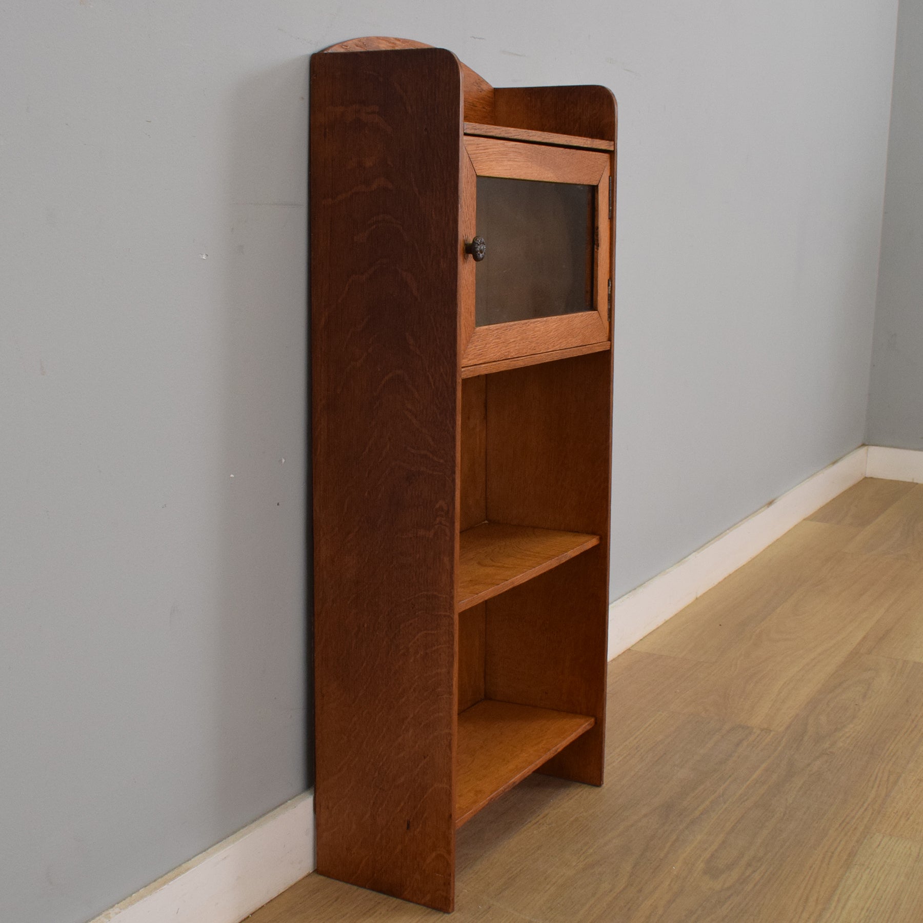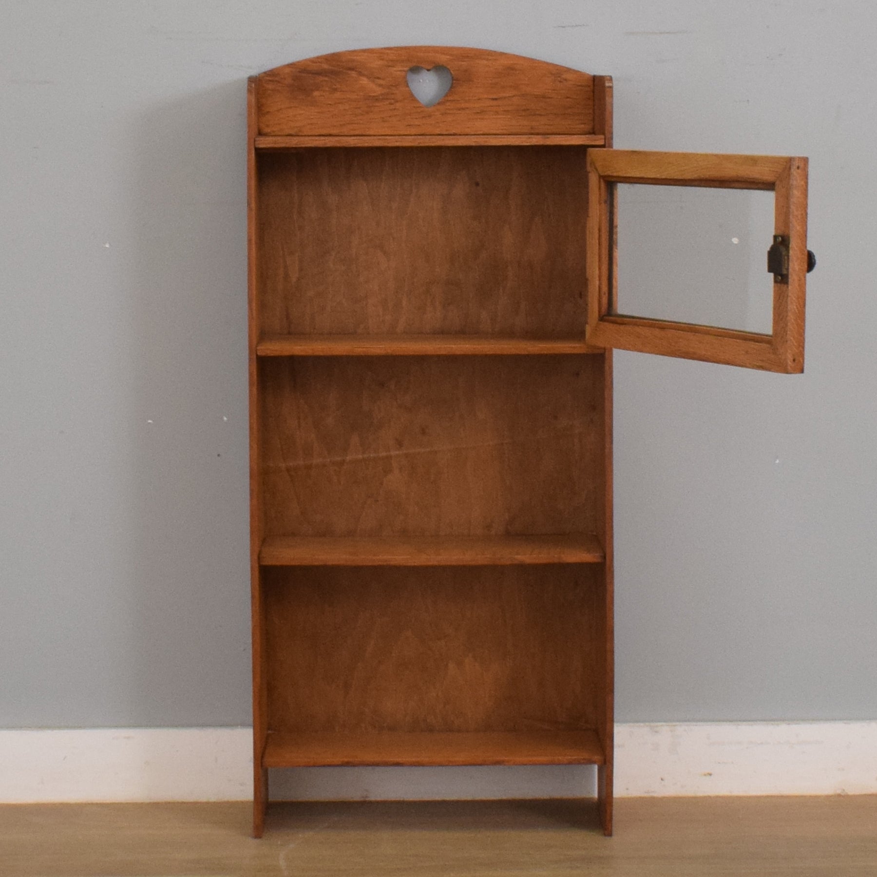 This charming oak bookcase features a glazed cupboard at the top, ideal for protecting items from dust, with two open shelves beneath for accessible storage. A sweet heart-shaped cut-out adds a decorative detail to the gently arched top panel, enhancing its country-style appeal. The wood grain is visible throughout, giving the piece a natural and authentic finish.