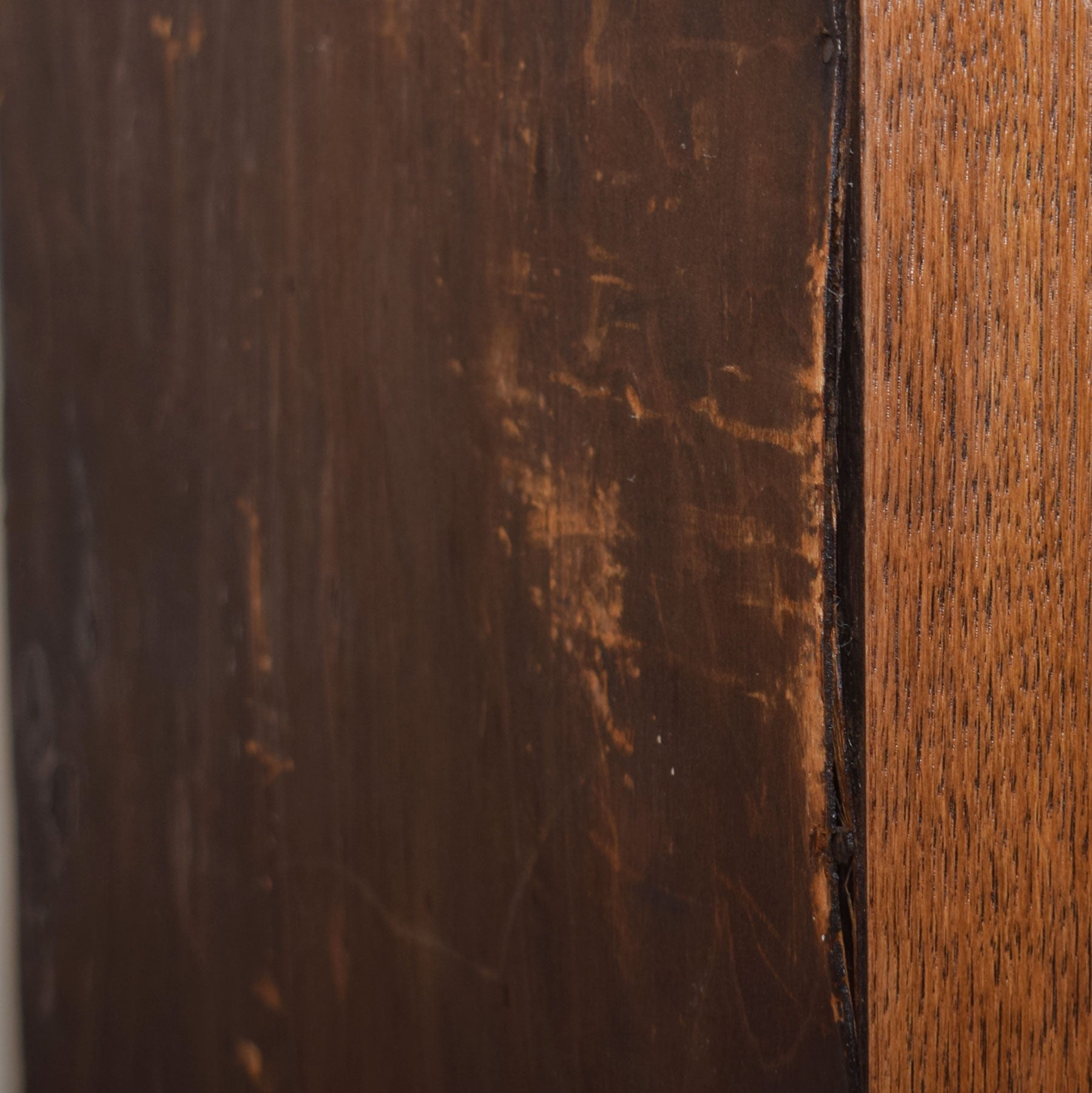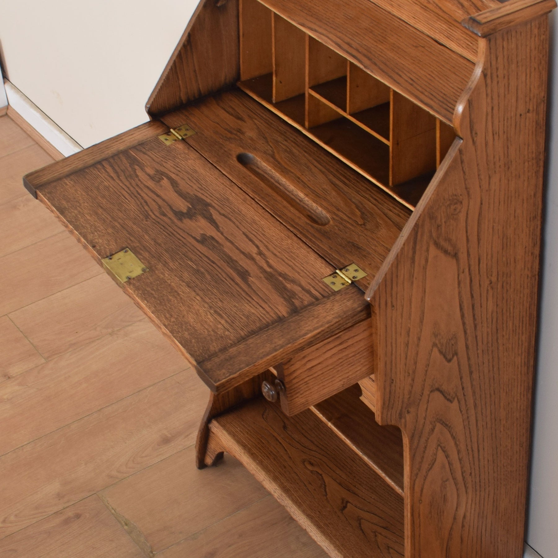 Our restoration workshop has stripped and cleaned this piece before applying a fresh matt lacquer that enhances the natural oak detail and also provides a good level of everyday protection. As with all lacquered wood furniture, care is required when placing hot or sharp items. The original metal handles have been retained, contributing to the bureau's authentic appearance. Primarily constructed from oak, this bureau features plywood organiser shelves, drawer compartments, and a back.