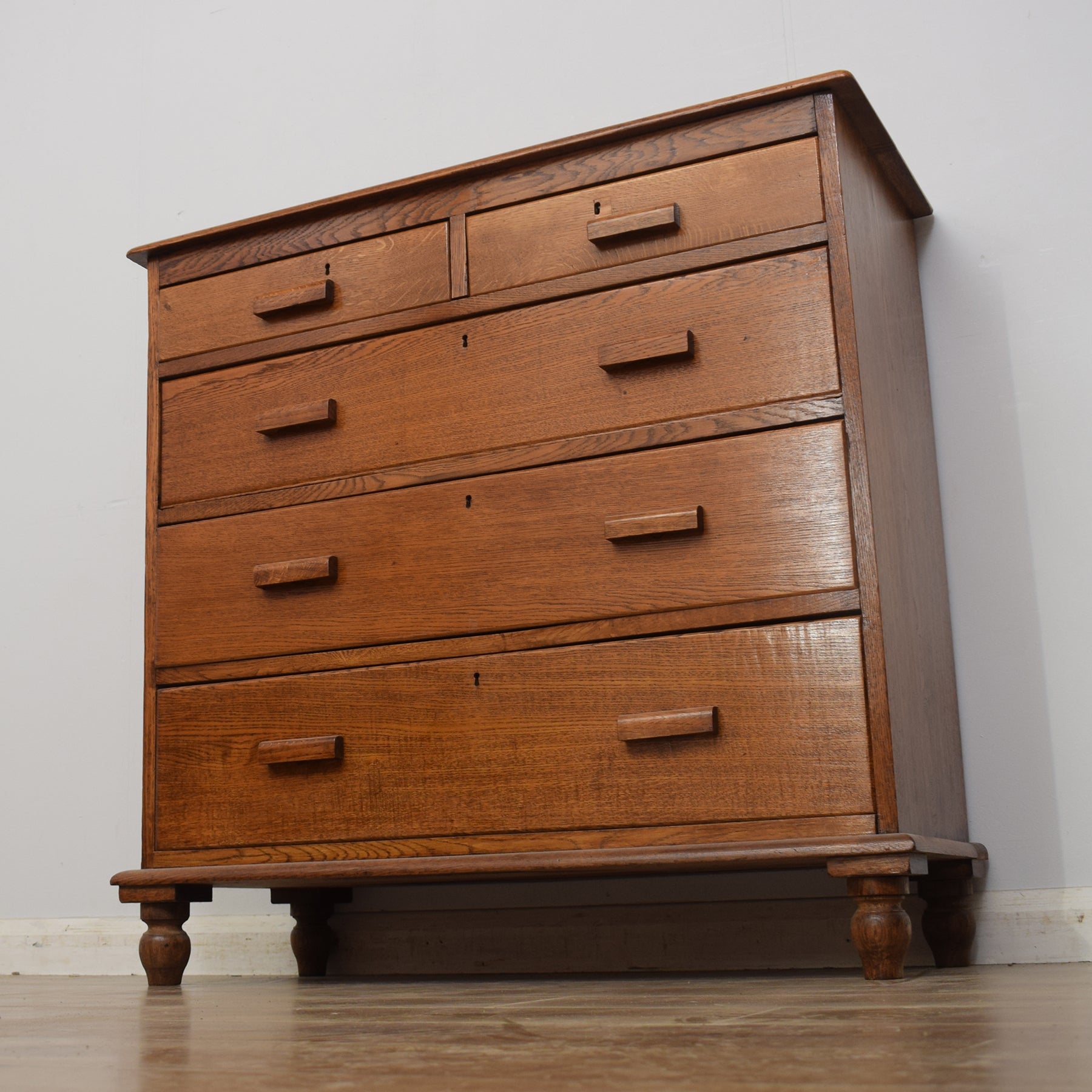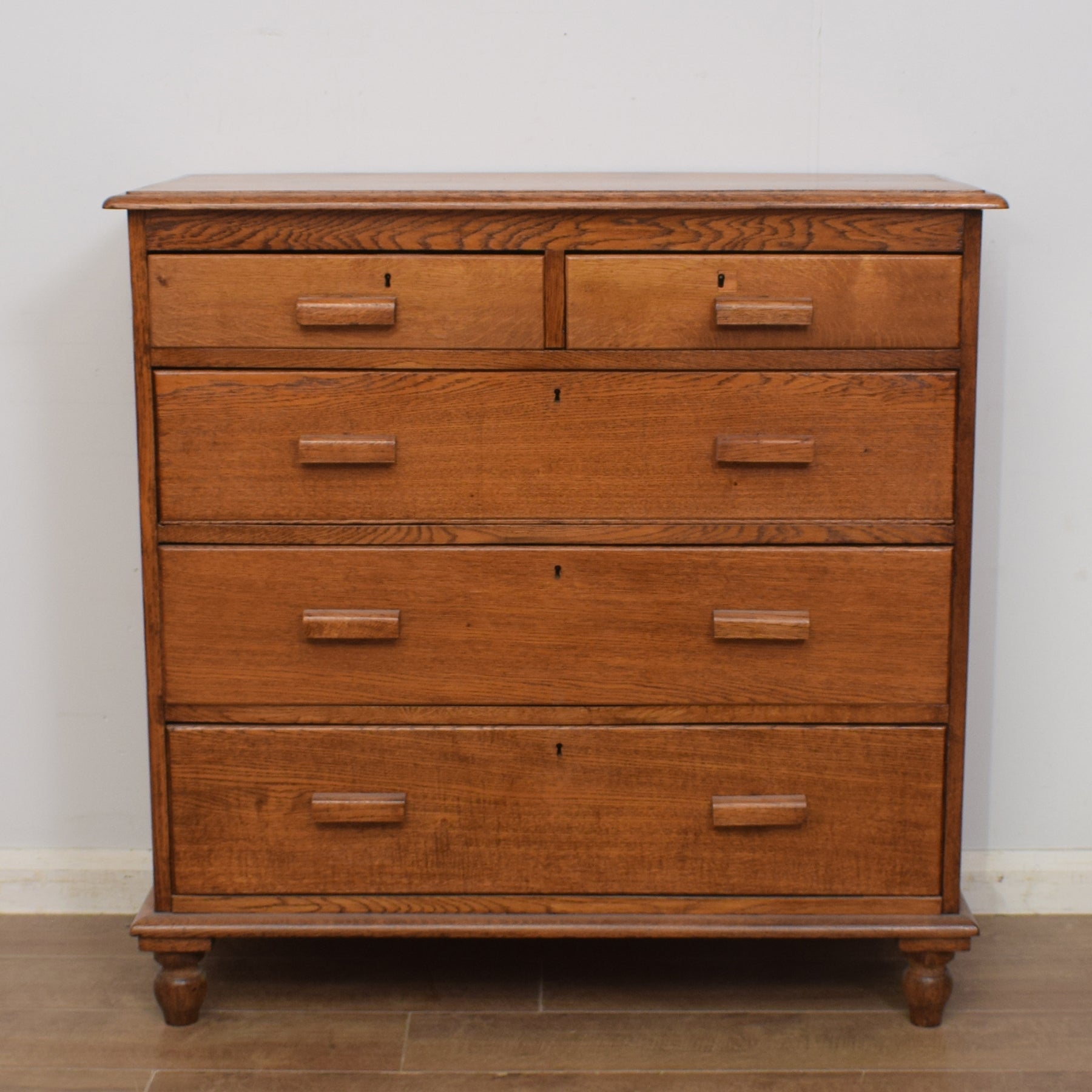 We have lovingly restored this chest of drawers by stripping back by hand the previous darker finish to reveal the natural tones and grain of the wood, before applying several spray coats of a clear lacquer to give an appealing and durable finish. This piece is made from solid oak and solid pine.