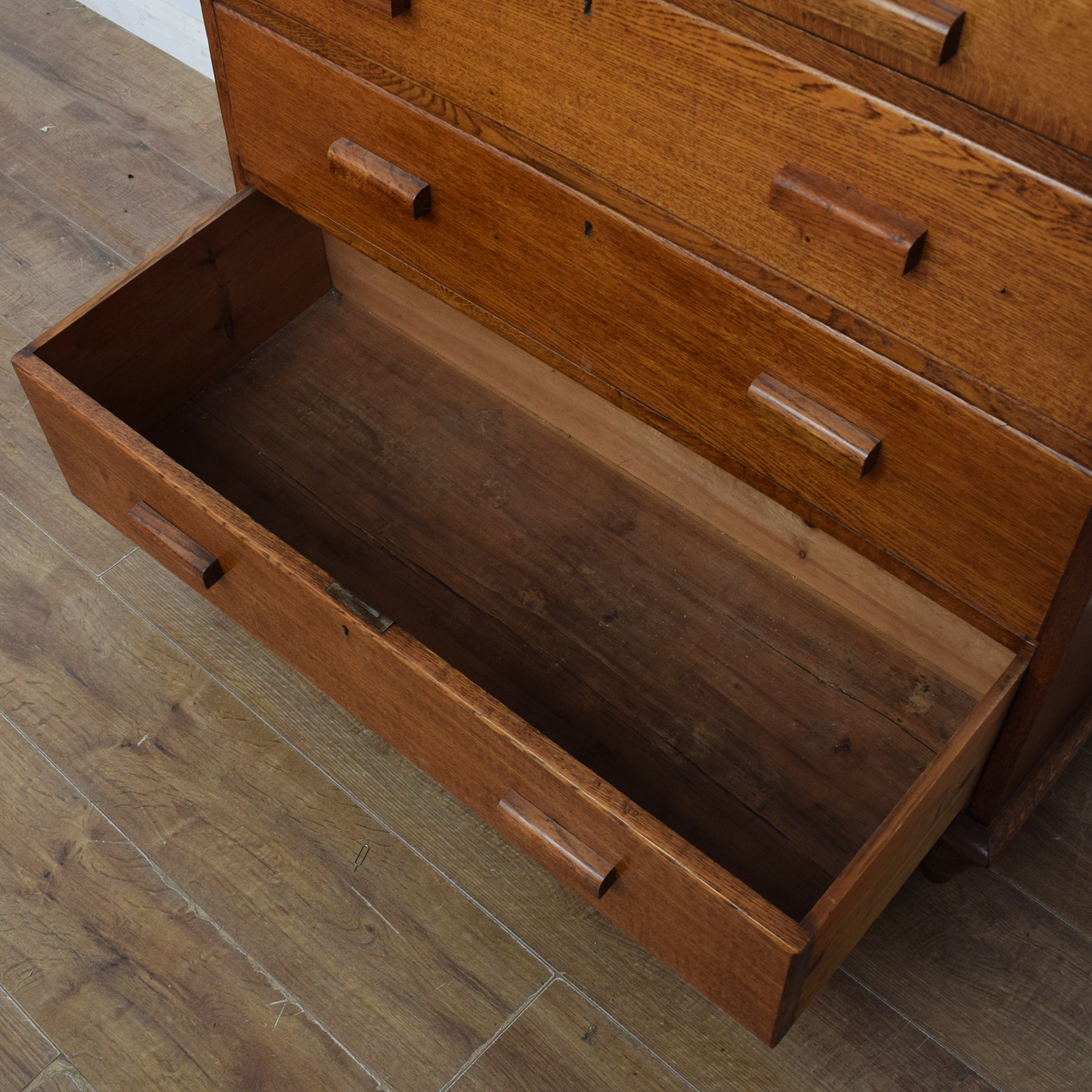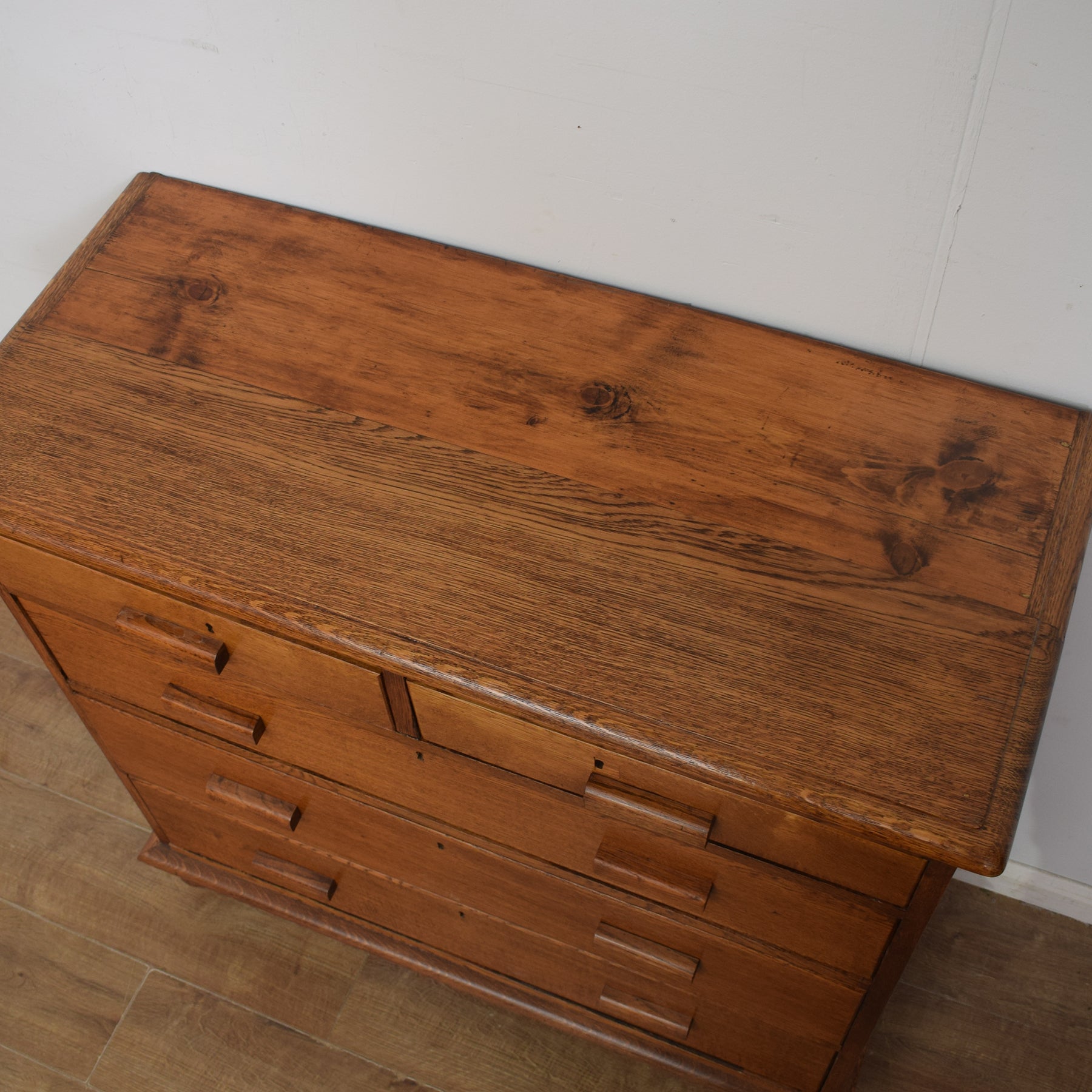 The richly-grained cabinet has a spacious top that is ideal for a lamp, a vase of flowers and treasured ornaments and photographs. The three full-width drawers and two half-width drawers provide a generous amount of storage for a variety of items. Before we received it, the original handles had been replaced on this chest, and we have carried out a small repair to one of the back legs, which can be seen in the penultimate photograph.