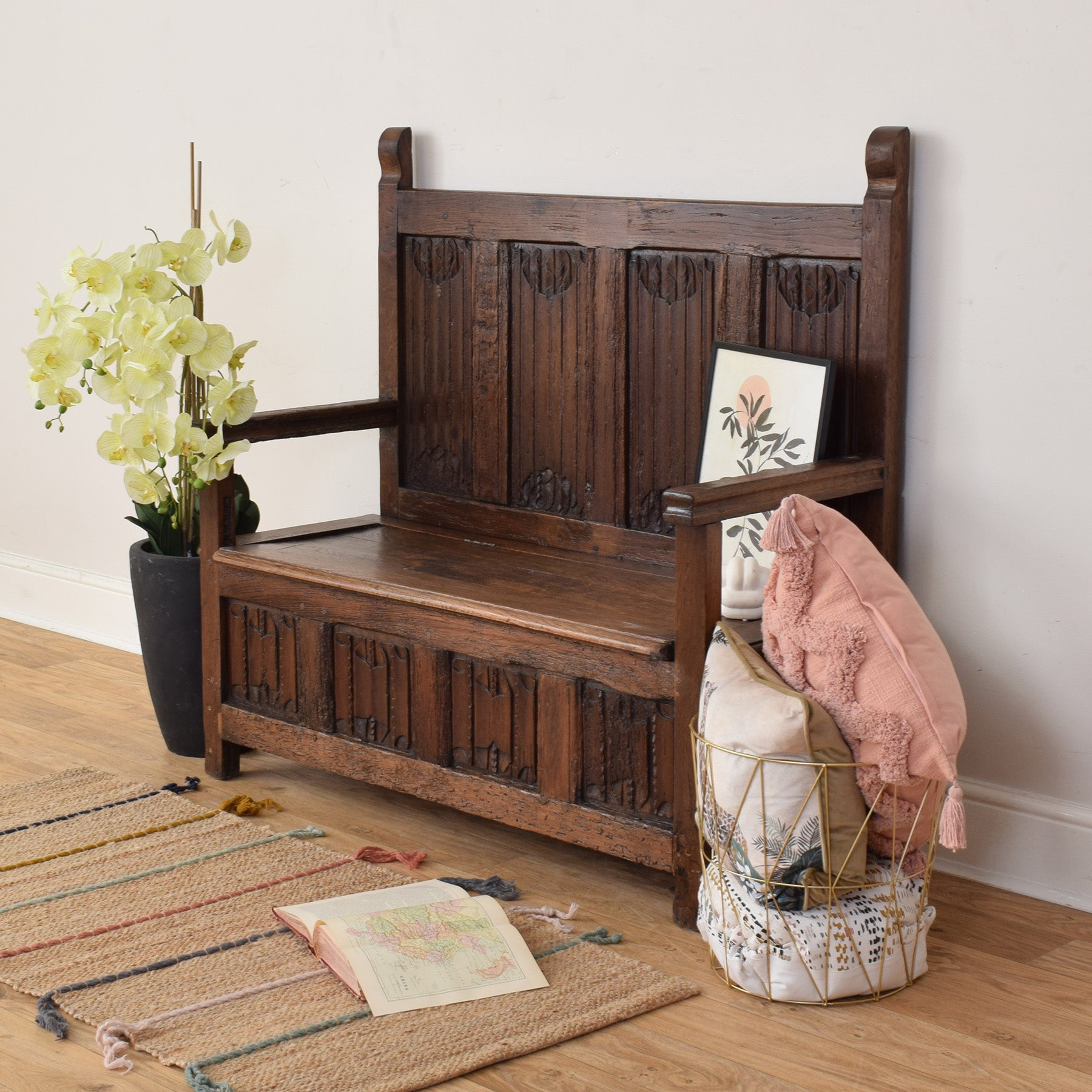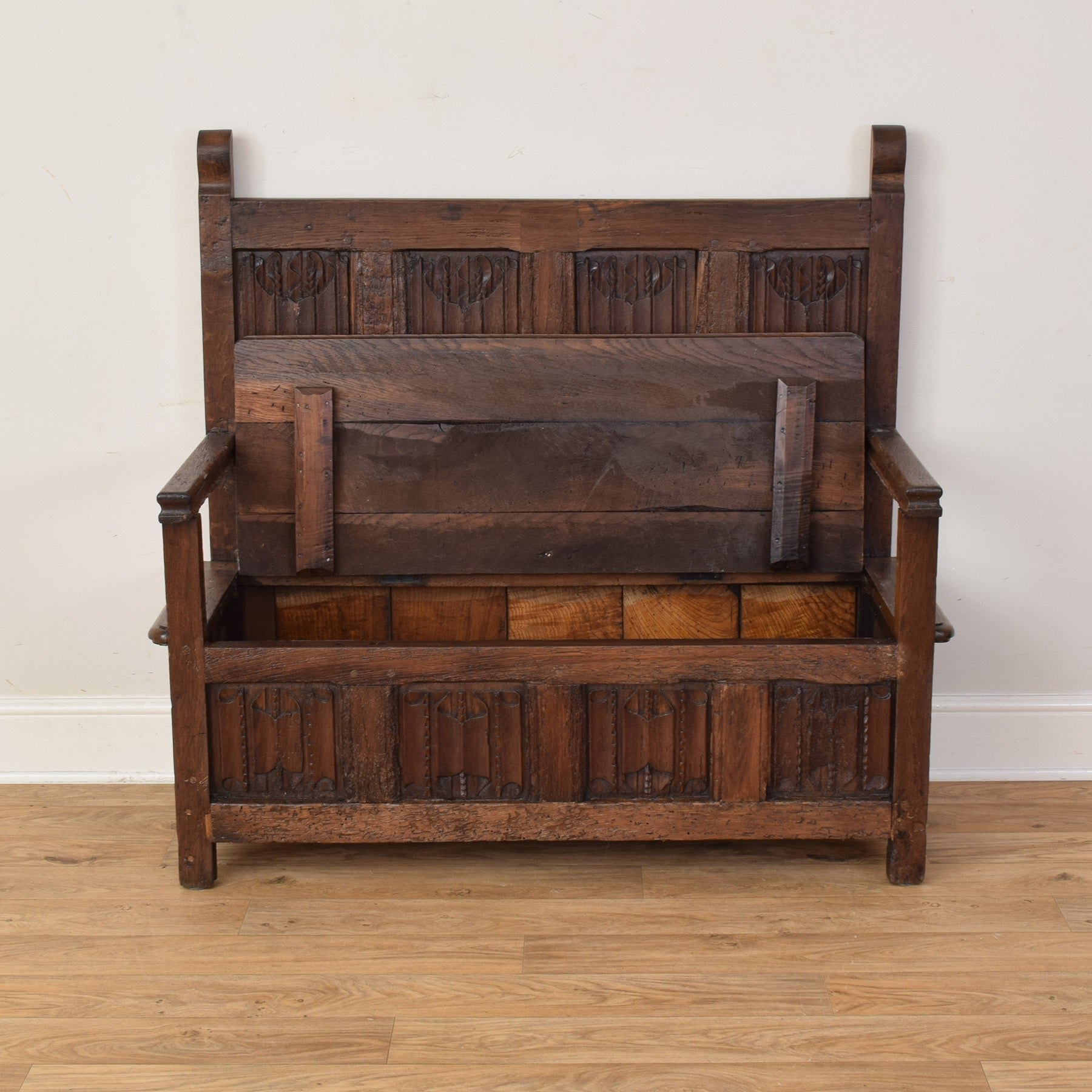 Overall, this is a characterful and honest antique settle that offers both seating and storage, with wear that reflects its long history rather than detracts from it. It would appeal to those looking for an authentic period piece with presence, practicality, and enduring charm.