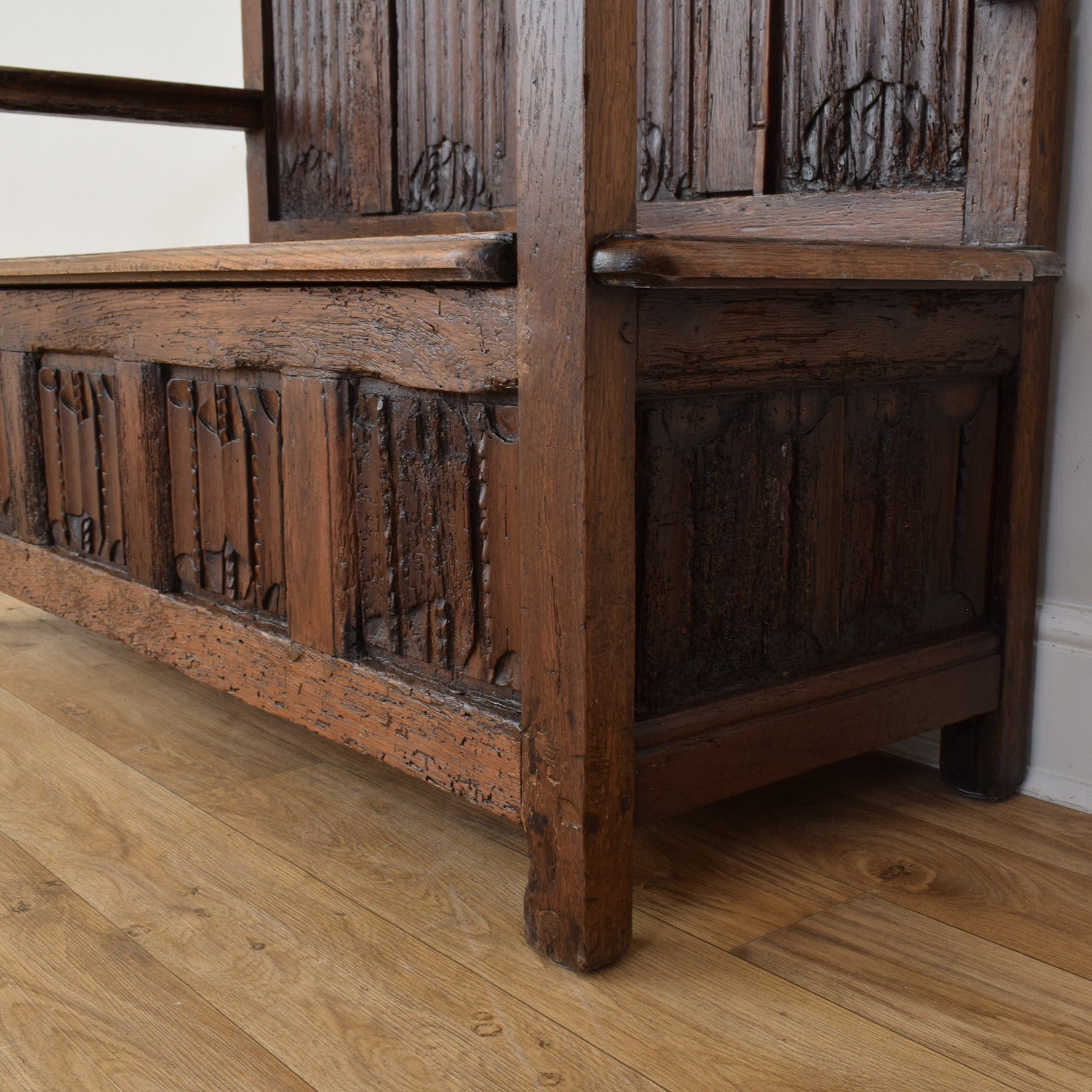 The settle features a tall panelled back with carved details, solid arms, and a wide seat that also offers internal storage beneath. The design reflects traditional craftsmanship, with heavy proportions and visible joinery that emphasise its robust construction. The rich oak grain and aged surface give the piece a depth and character that cannot be replicated in modern furniture.
