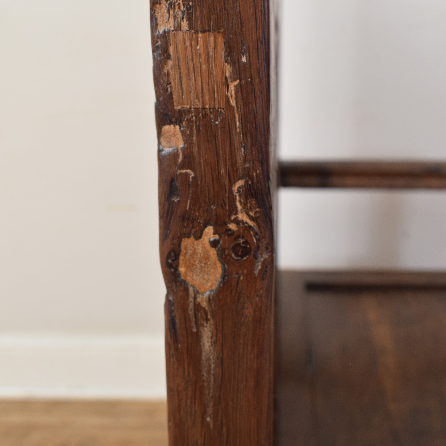 The settle has been fully stripped back and then finished with multiple coats of hard-wearing lacquer, providing a durable, long-lasting surface while allowing the natural oak grain and colour to show through. There are signs of previous woodworm, which is no longer active; the affected areas have been treated as a precaution. Various splits, scuffs, and knocks are present throughout, all consistent with a piece of this age, none of which affect the structural integrity of the piece. This is all documented in the accompanying photographs. This item is made entirely from solid oak.