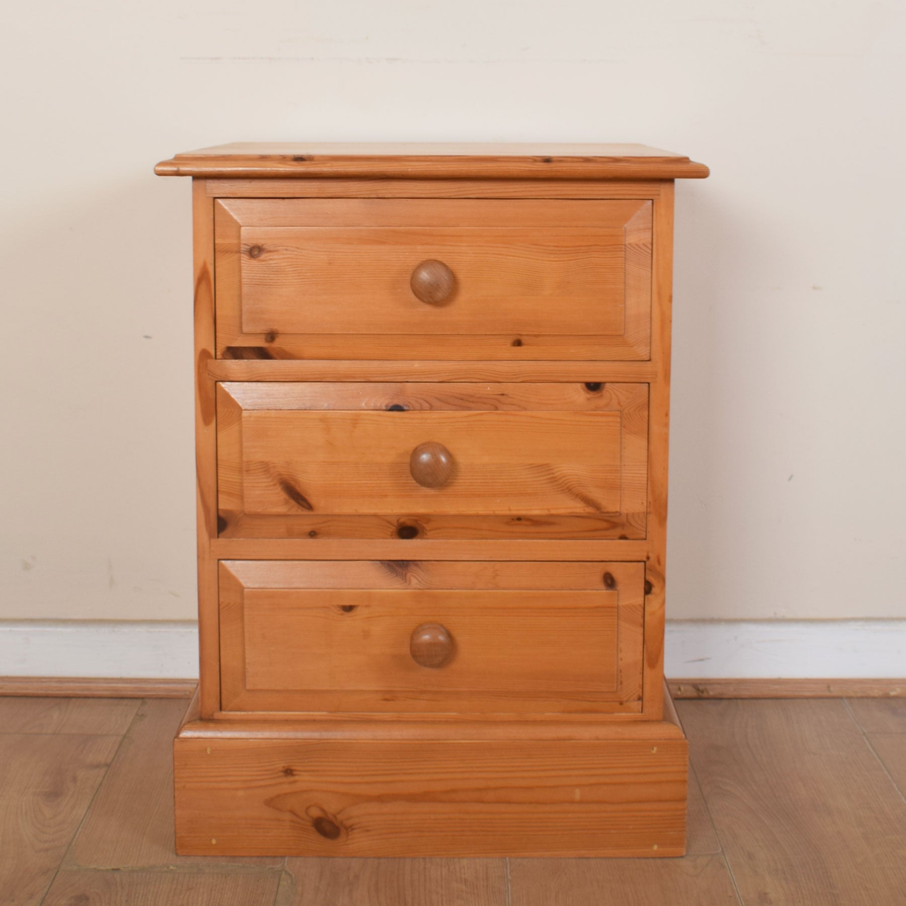 This pine bedside table features a simple, classic design that includes three drawers. Its light hue and prominent grain provide a soft, welcoming quality that complements various room styles. The flat pine surface serves as an ideal spot for a bedside lamp, as well as photographs of family or cherished individuals.