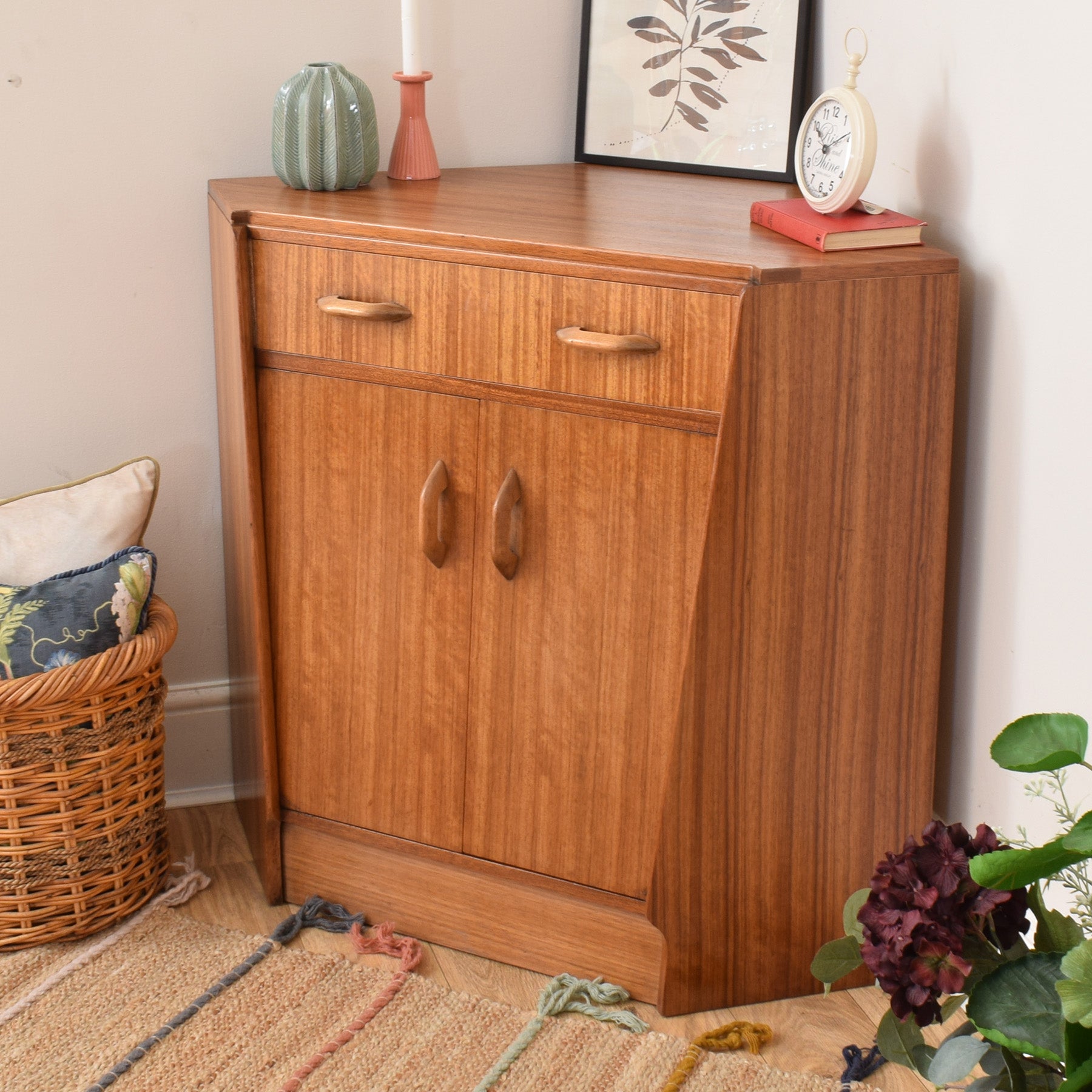 With its combination of clever storage and warm teak tones, this corner bureau offers a practical solution for organised living while adding a timeless, understated presence to any room.