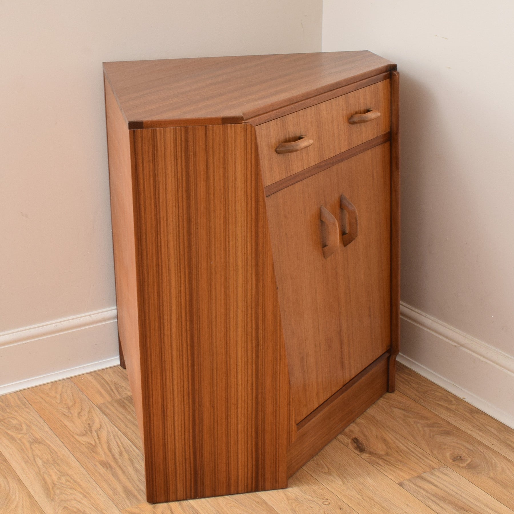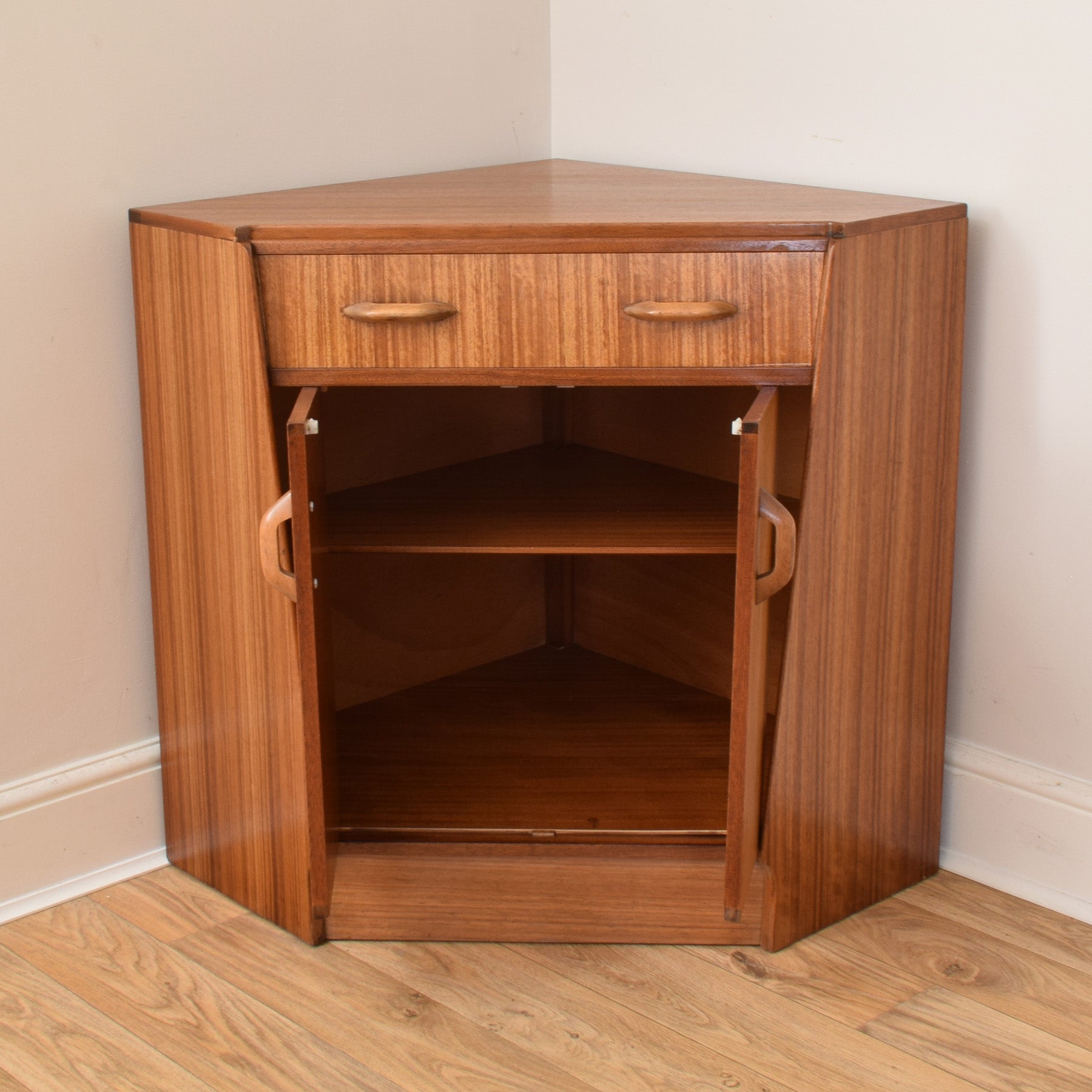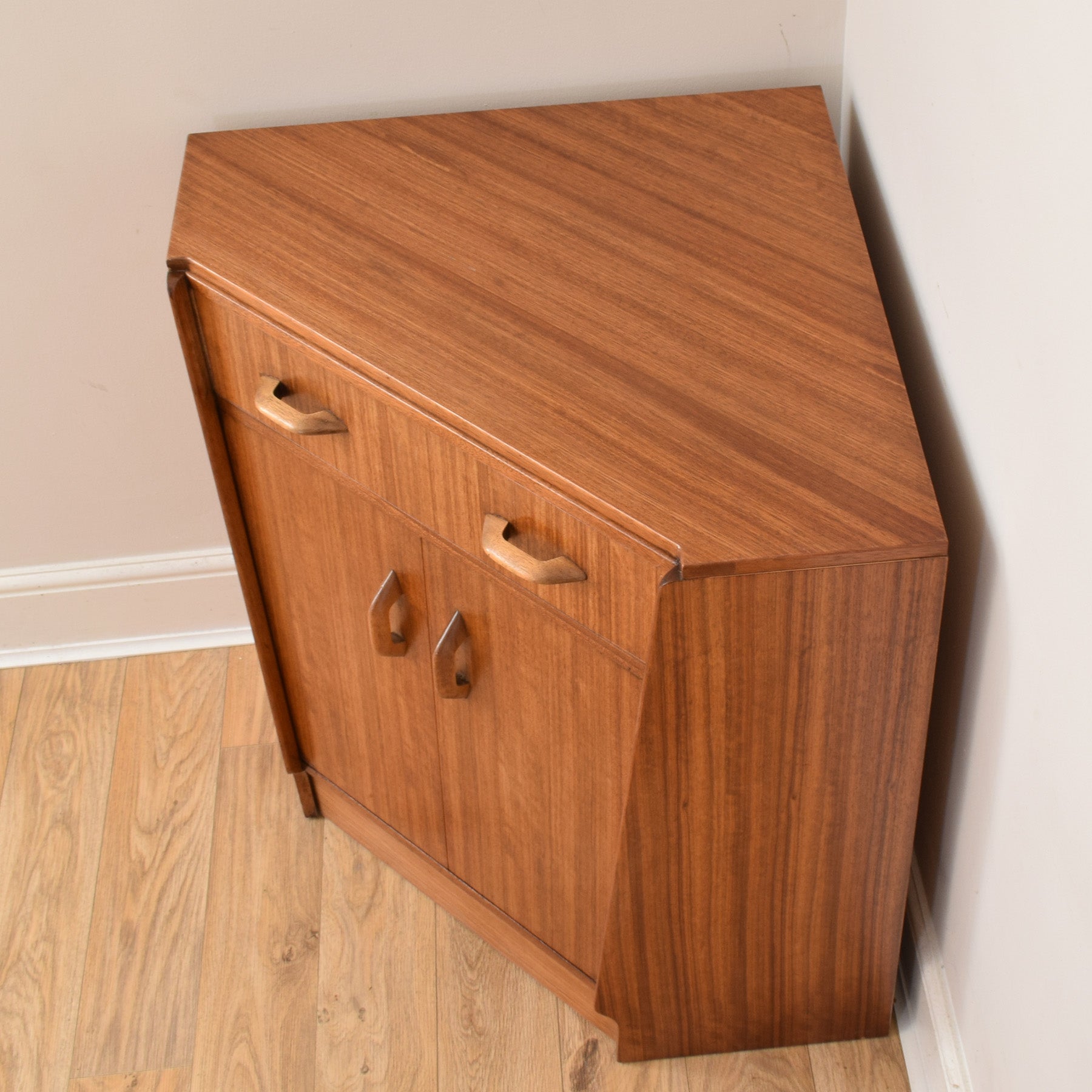 This teak corner bureau features a well-proportioned triangular top with a rich, linear grain pattern that highlights the character of the teak veneer. The fall-front door opens to reveal a thoughtfully arranged interior, complete with shaped pigeonholes and small compartments that are perfect for storing letters, documents, or stationery. Below, a pair of cupboard doors provide additional enclosed storage, while the shaped wooden handles add a subtle mid-century touch. The compact footprint makes it particularly suitable for smaller rooms or alcoves where space is at a premium.