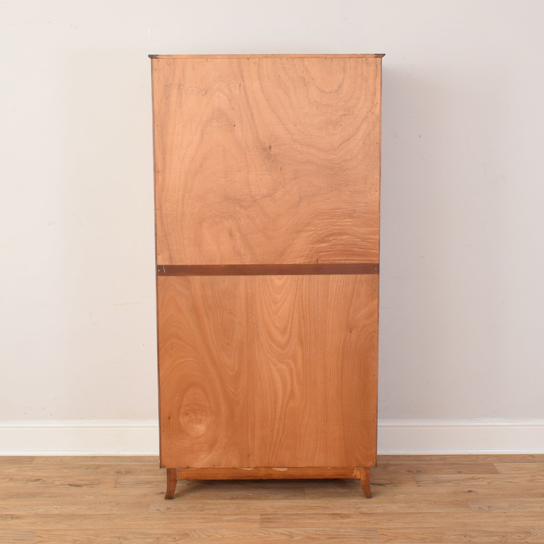 The previous darker stain has been carefully stripped, and several coats of hard-wearing matte lacquer have been applied, bringing out the beautiful warmth and grain of the teak veneer while ensuring a durable, long-lasting finish. This item is made using a teak veneer with a plywood rear panel. There is achip in the top trim at the rear, this is visible in the accompanying photographs.