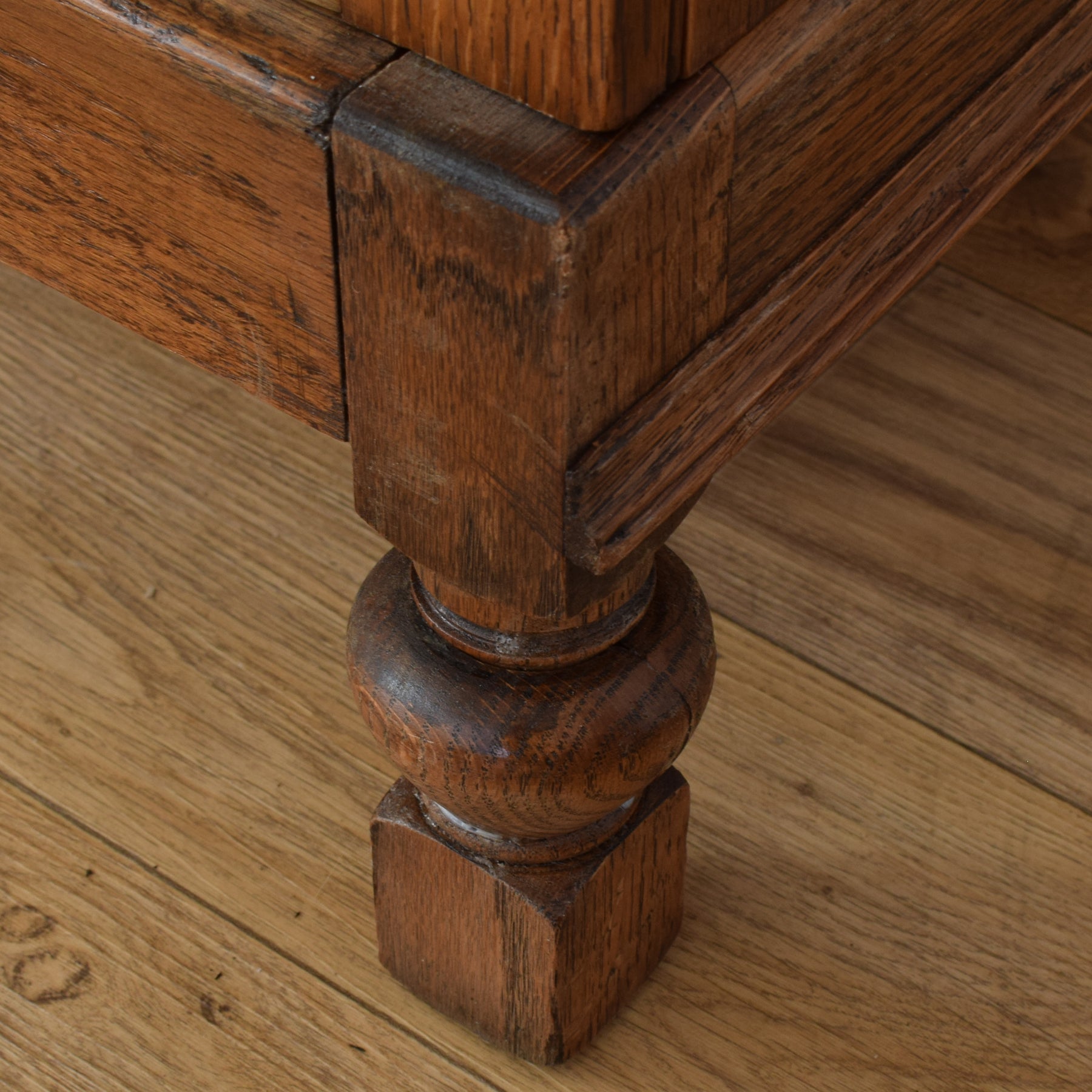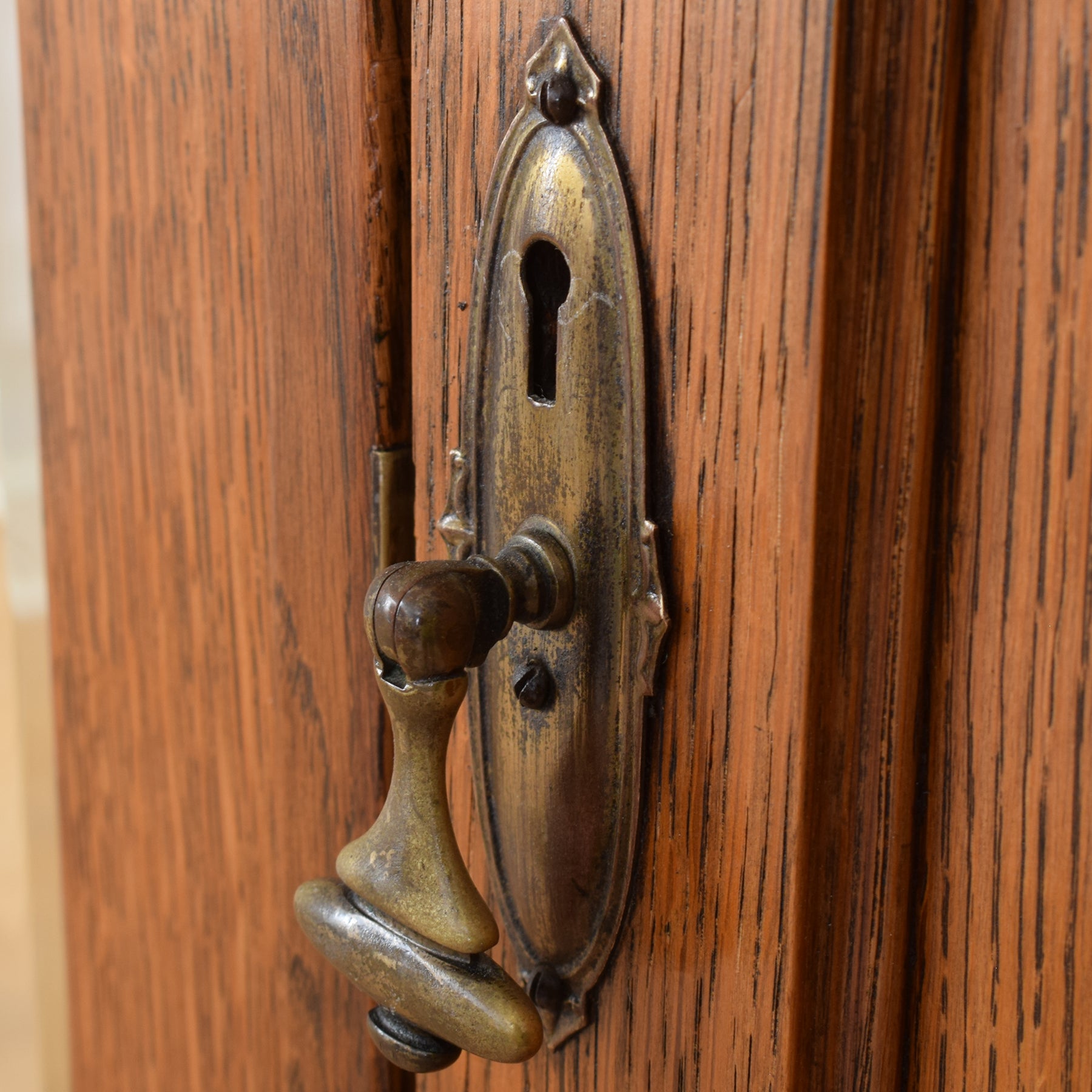 The previous darker stain has been fully stripped away, and multiple coats of hard-wearing matte lacquer have been applied. This finish offers a durable, long-lasting surface and highlights the natural grain of the wood. This item is made from a mixture of solid oak and oak veneer, with a plywood rear panel.