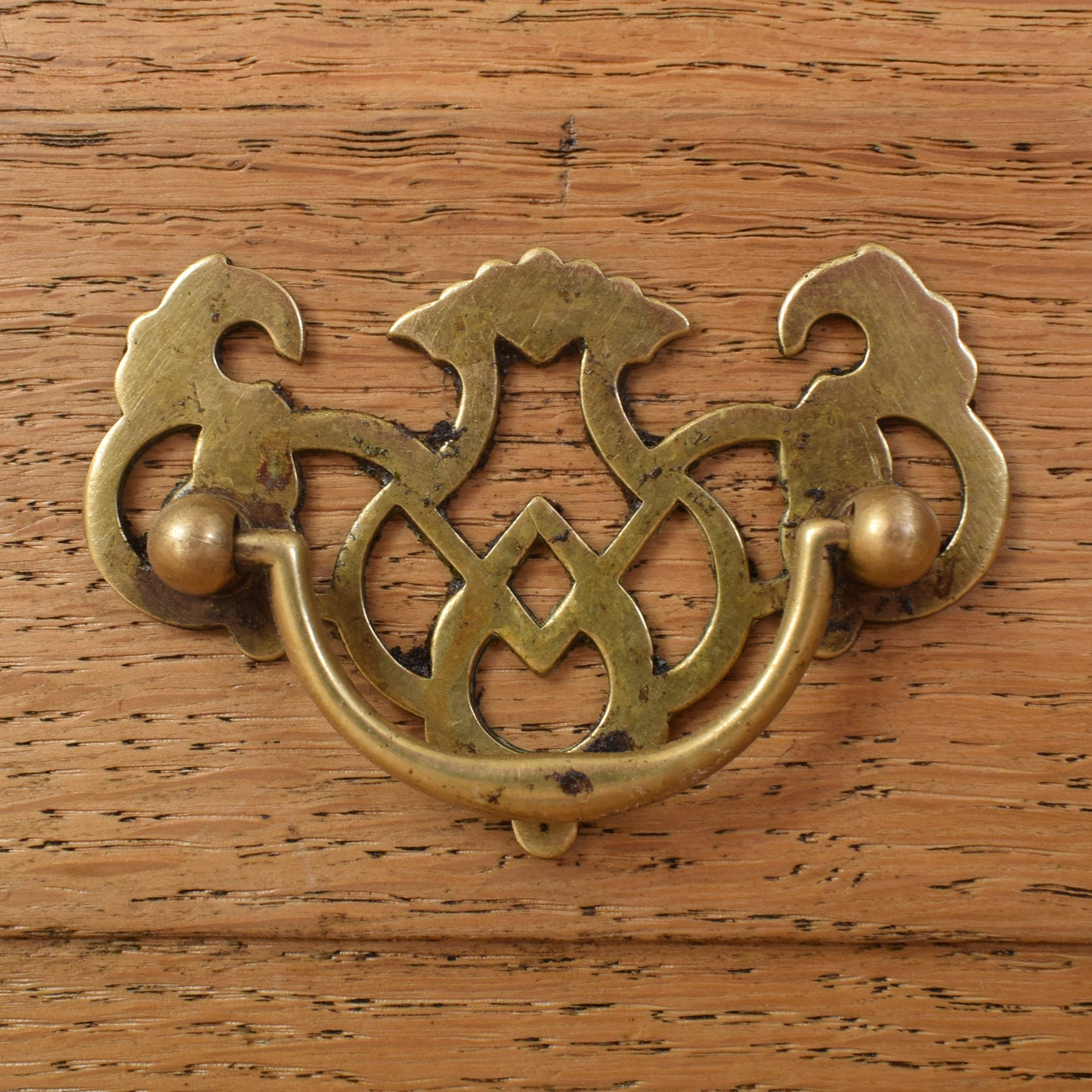 This TV cabinet features the appearance of two drawers, but the front panel opens downwards to reveal a spacious interior with a fixed shelf and two small internal drawers to the right. The brass handles and shaped bracket feet add a touch of classic charm, while the solid oak construction ensures lasting quality and strength.