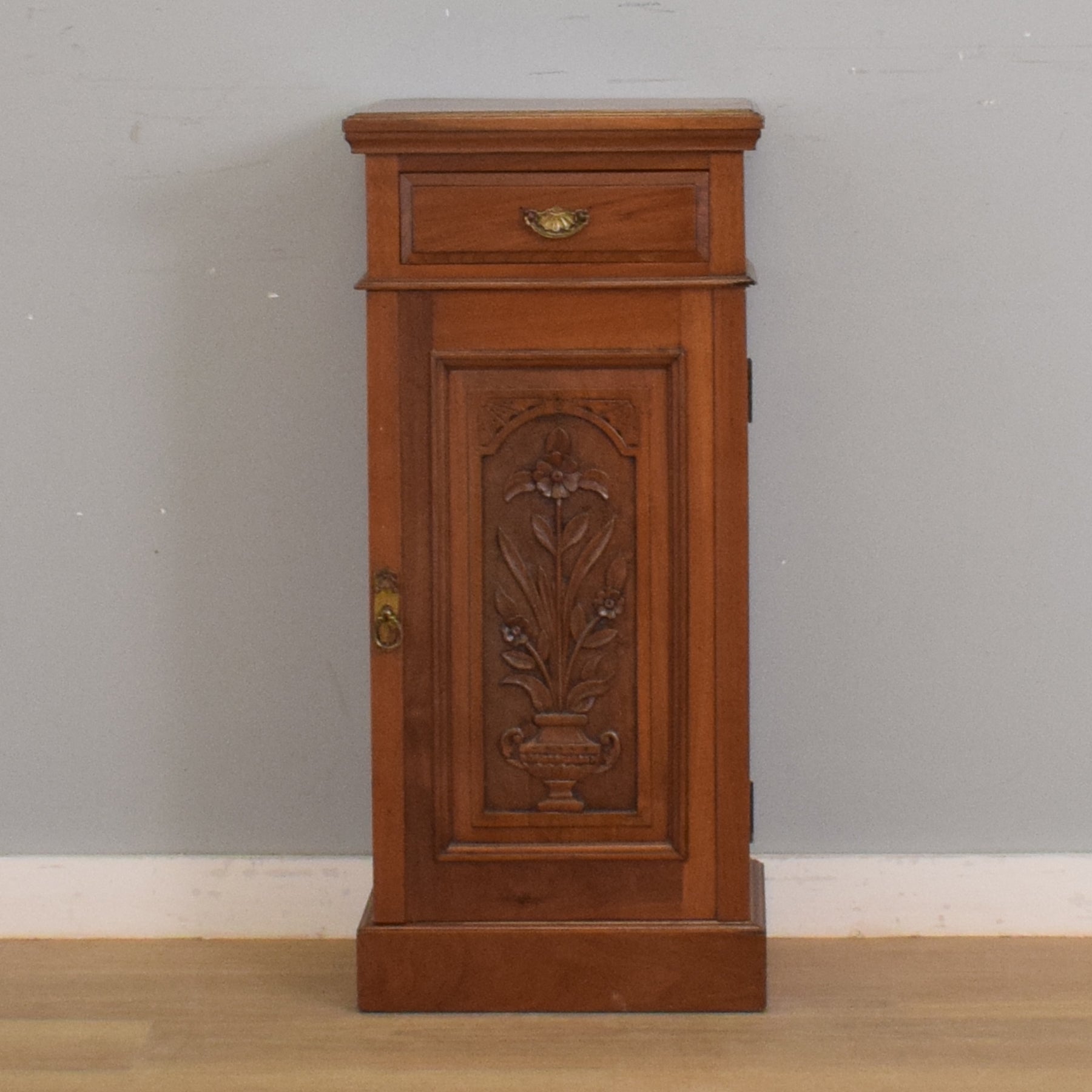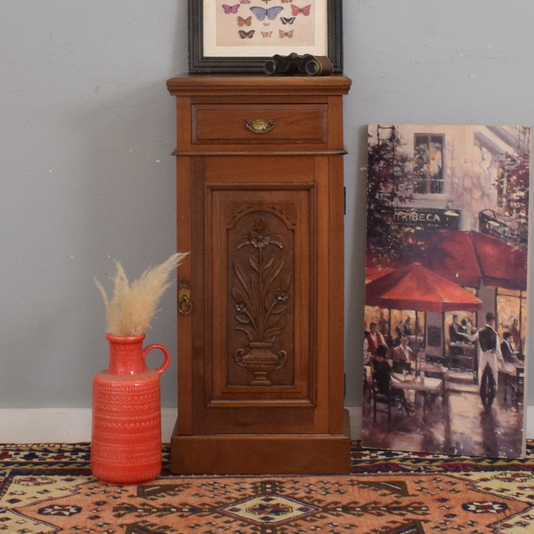 This mahogany cabinet offers a practical combination of a top drawer and a lower cupboard, making it ideal for smaller spaces where storage still matters. The door features a decorative carved floral panel, complemented by traditional brass handles, and the interior includes a fixed shelf for neatly separating contents.