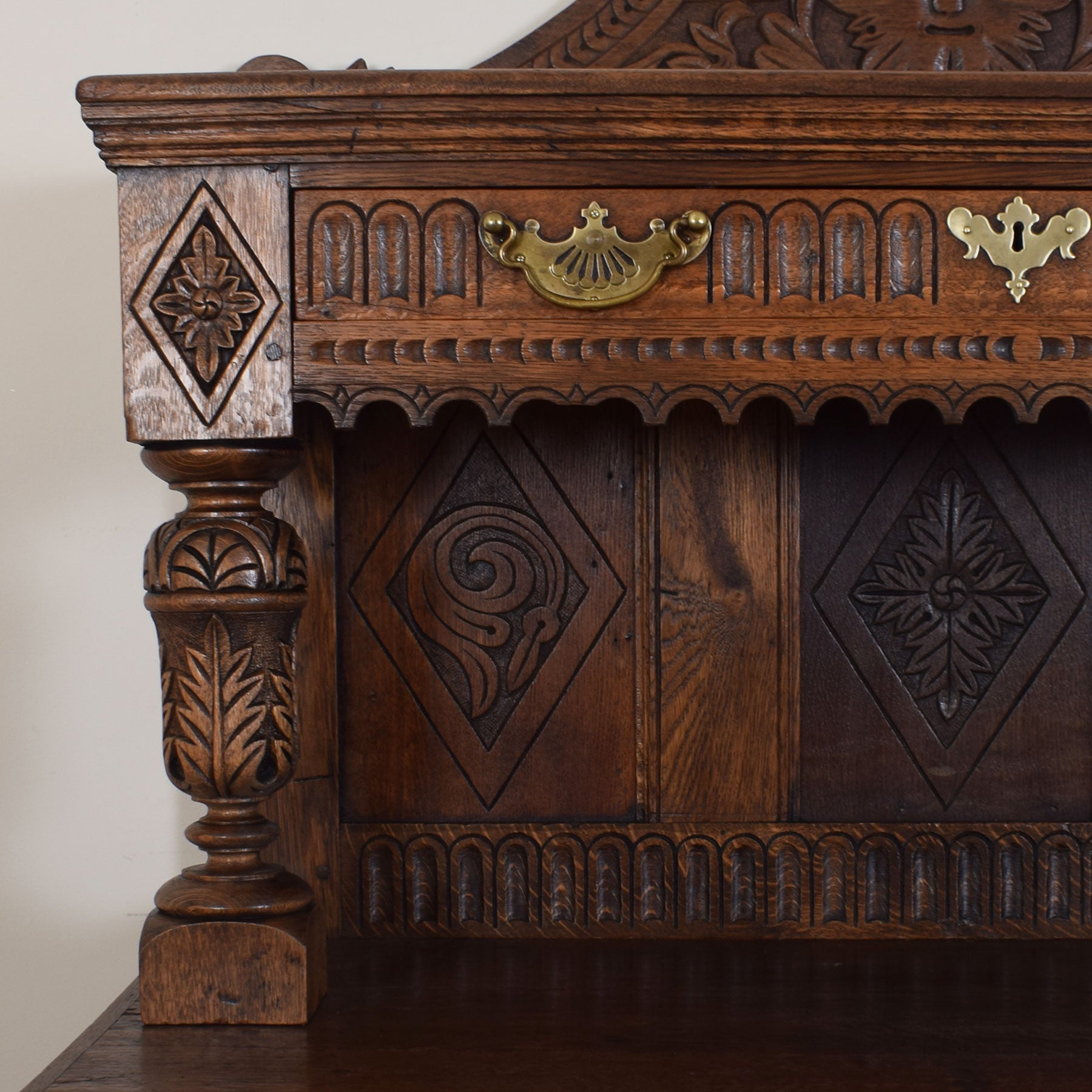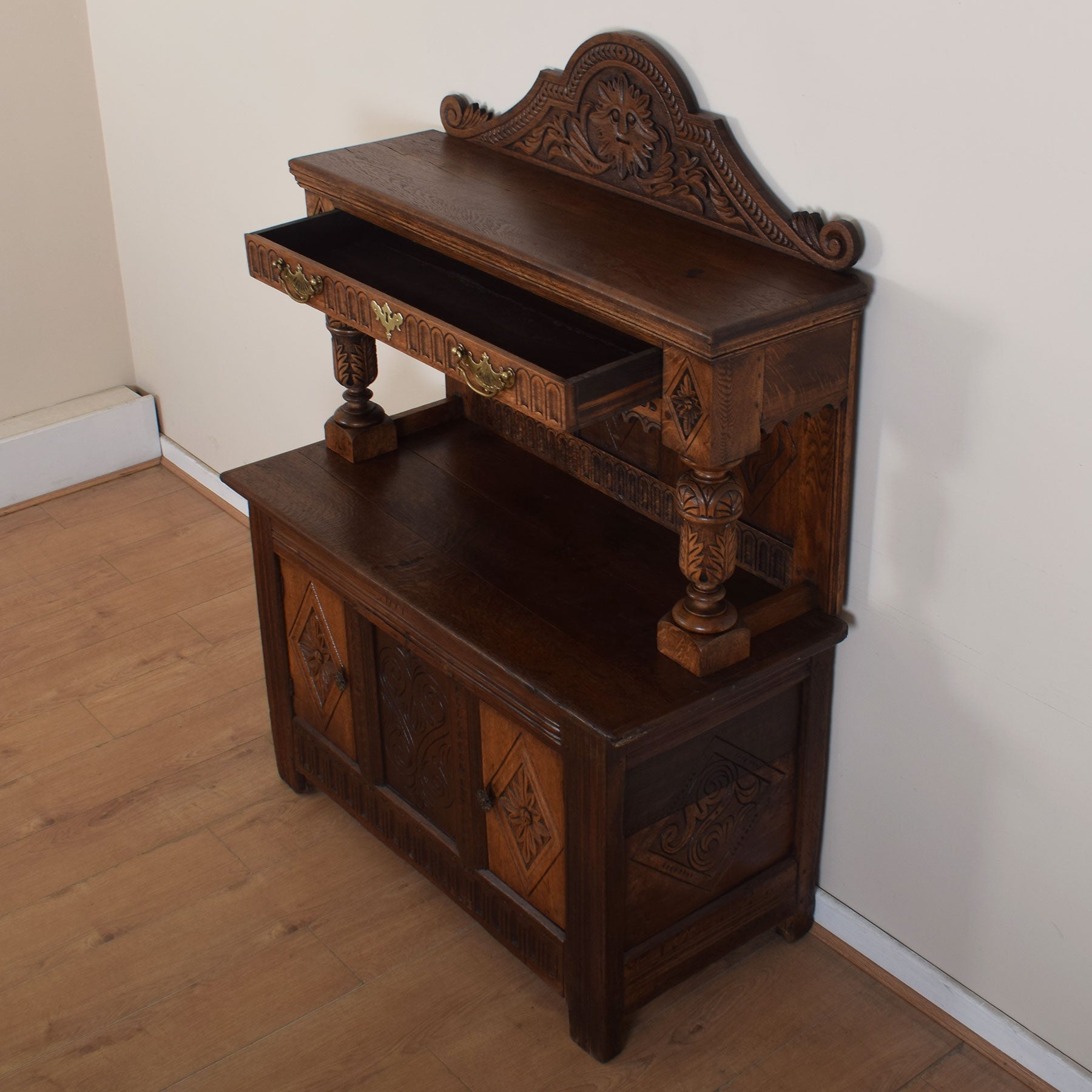 This beautifully detailed, carved vintage dresser in dark oak is sure to be a much-admired and well-loved addition to the lounge, hallway or other family space.