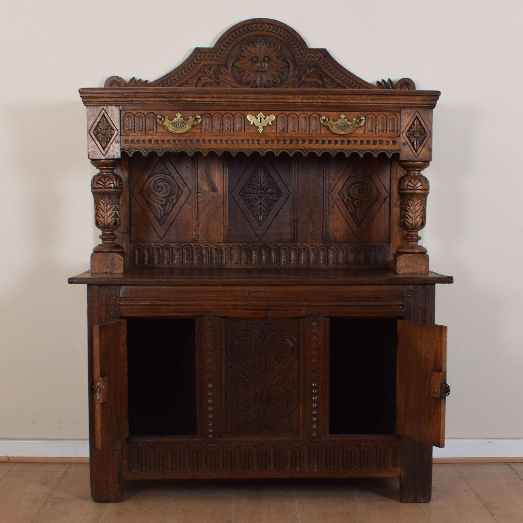 The upper section includes a display shelf with a useful full-width drawer supported by traditionally carved columns on each side. This sits on the lower unit, which features a two-door cupboard below a spacious top surface that is ideal for ornaments and collectables. This elegant piece is oak throughout.