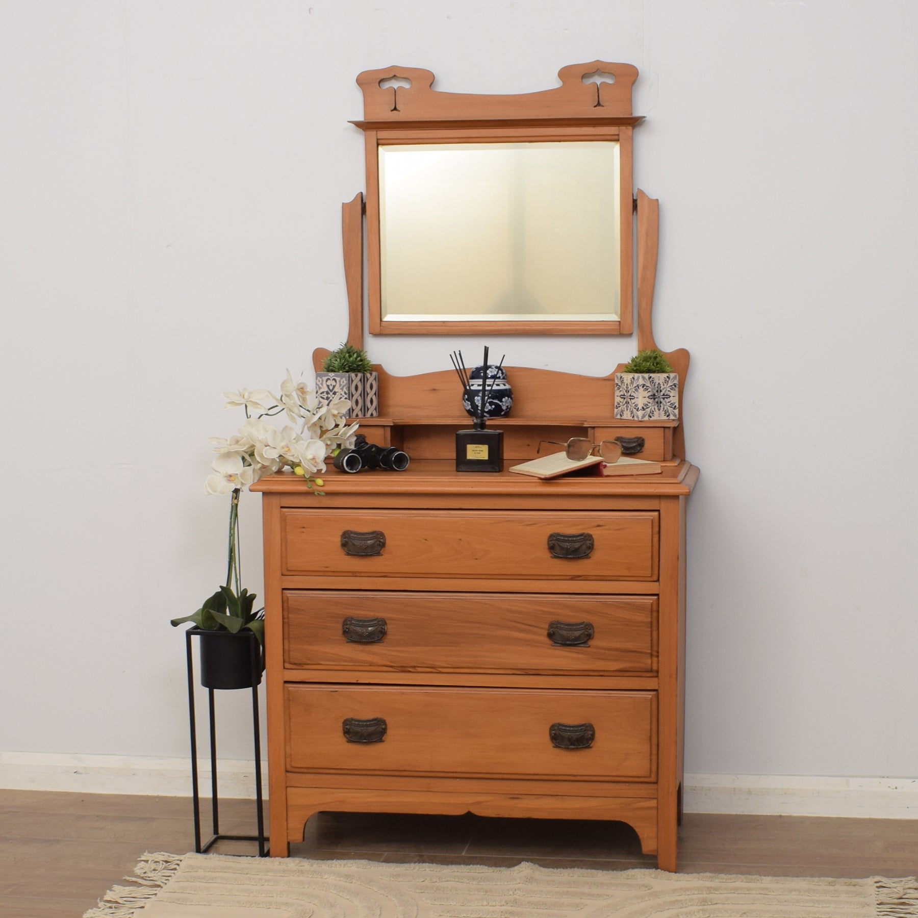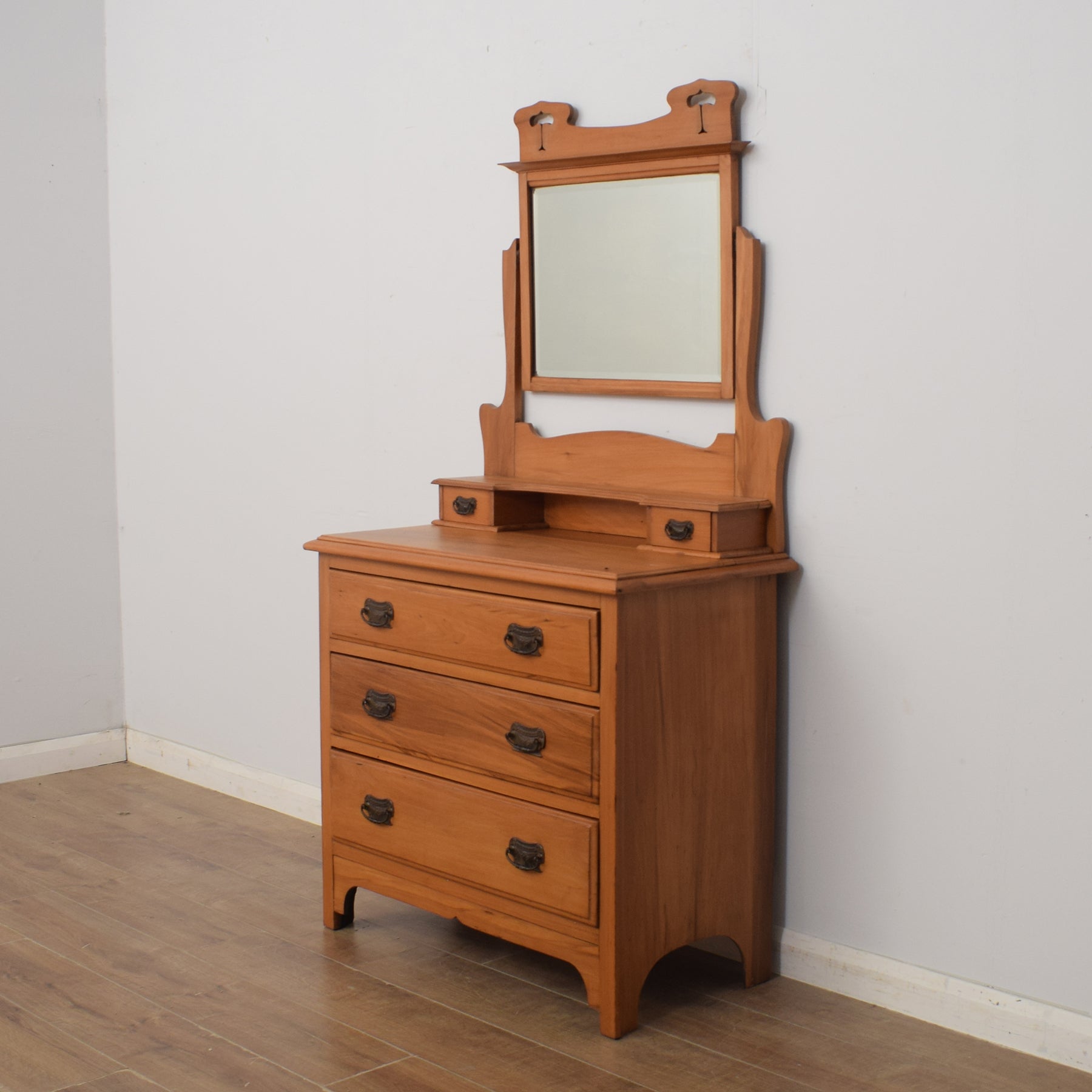This vintage satinwood dressing table features a bevel-edged tilting mirror set within a shaped frame. The upper surface includes two petite drawers, ideal for jewellery or keepsakes, and a central shelf for display or additional use. Below, three spacious drawers provide excellent storage for clothing or accessories. Antique-style brass handles complete the period character of the unit.