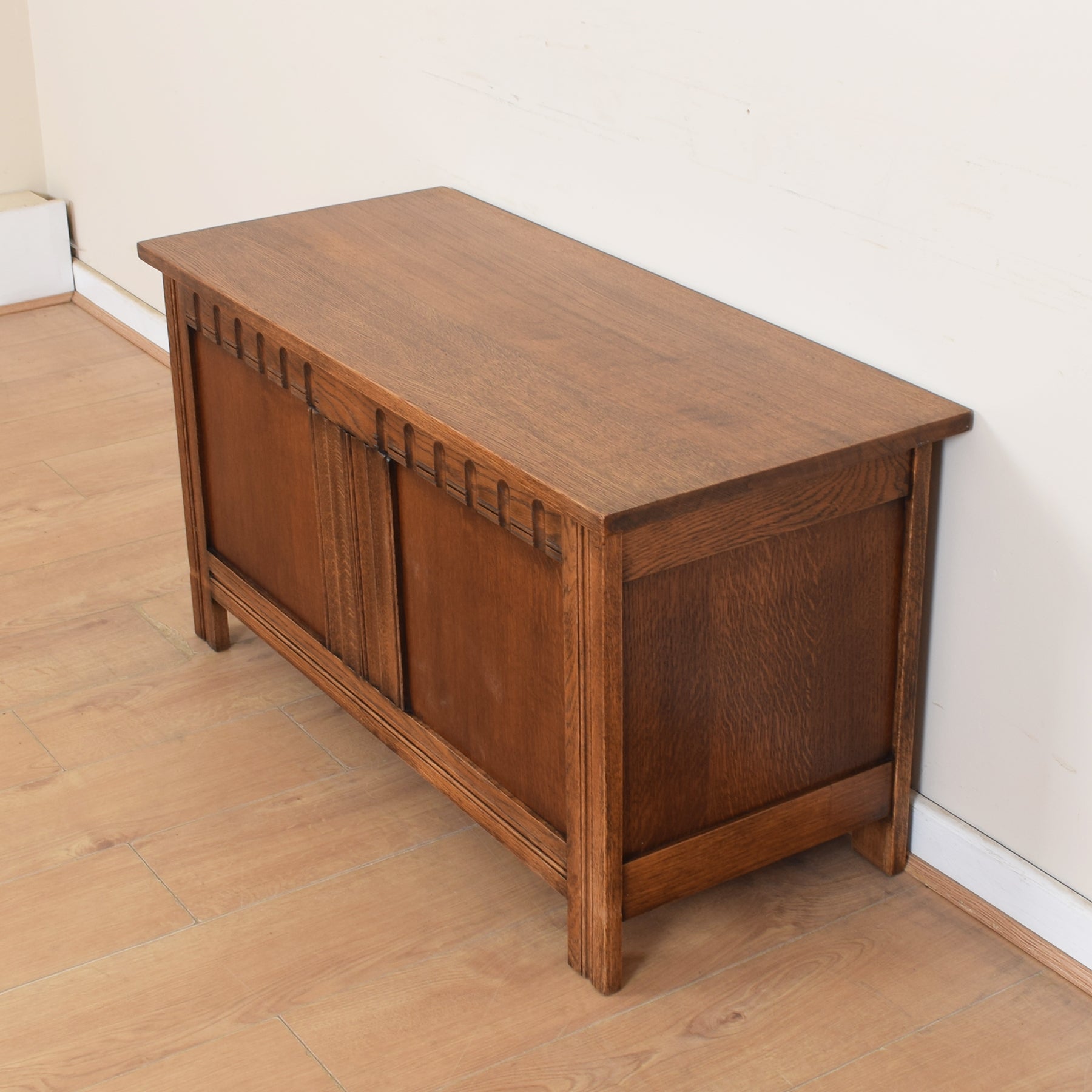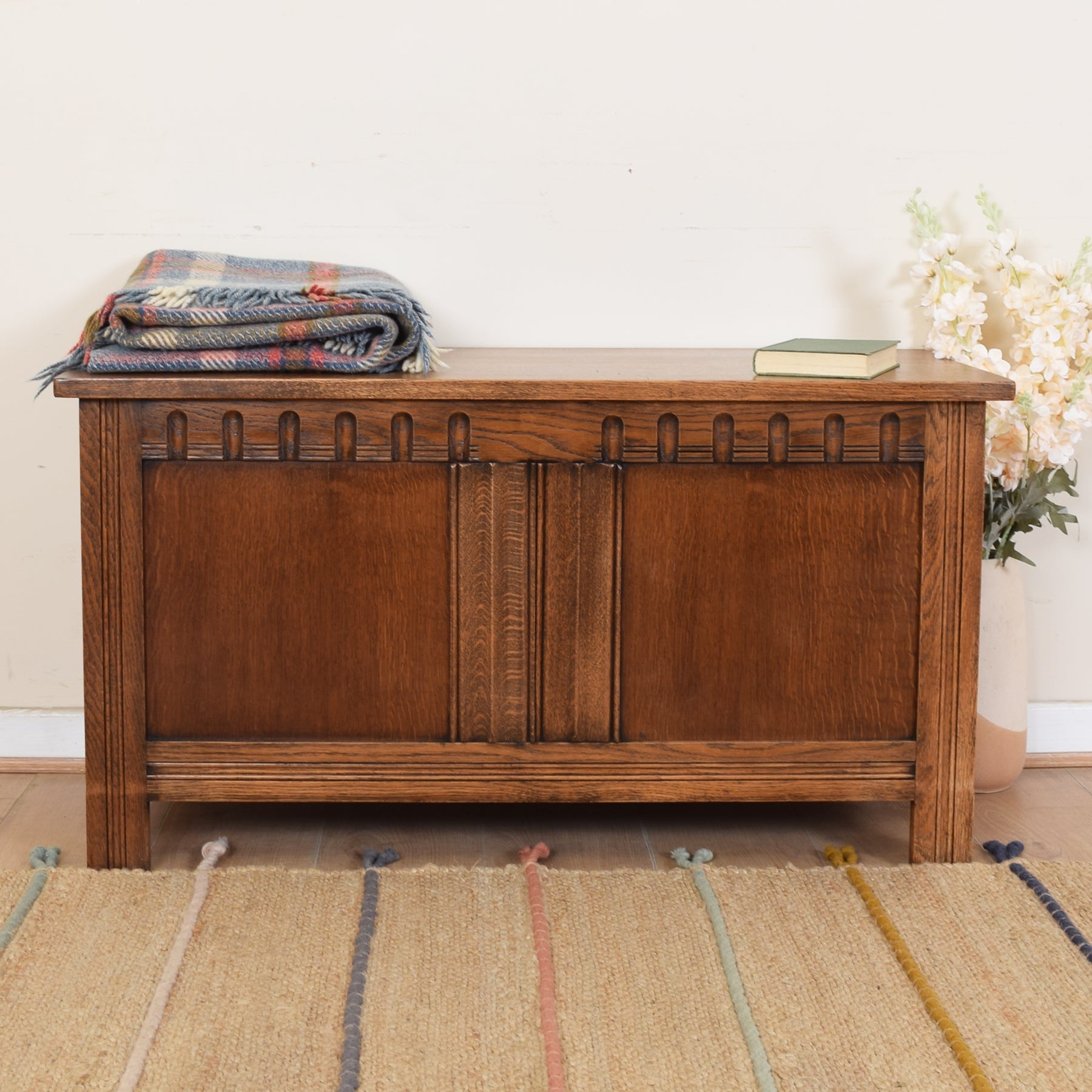 Our professional restoration workshop has stripped the original varnish from this blanket box before applying a fresh matt lacquer finish that enhances the rich oak character and provides a good level of protection in careful everyday use.