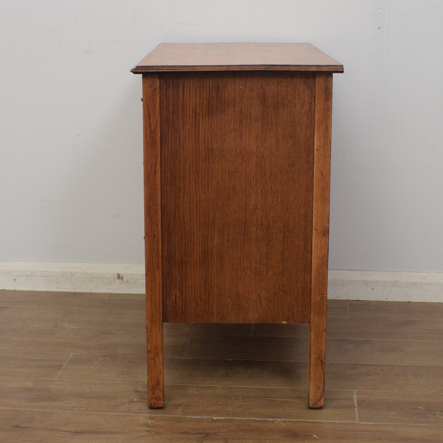 We have lovingly restored this chest of drawers by stripping back by hand the previous darker finish to reveal the natural tones and grain of the wood, before applying several spray coats of a clear lacquer to give an appealing and durable finish. This piece is largely made up of solid oak; the drawer bases and back panel are made from plywood.