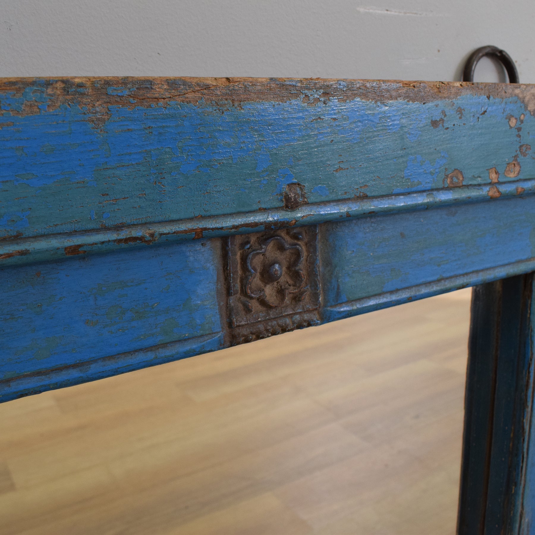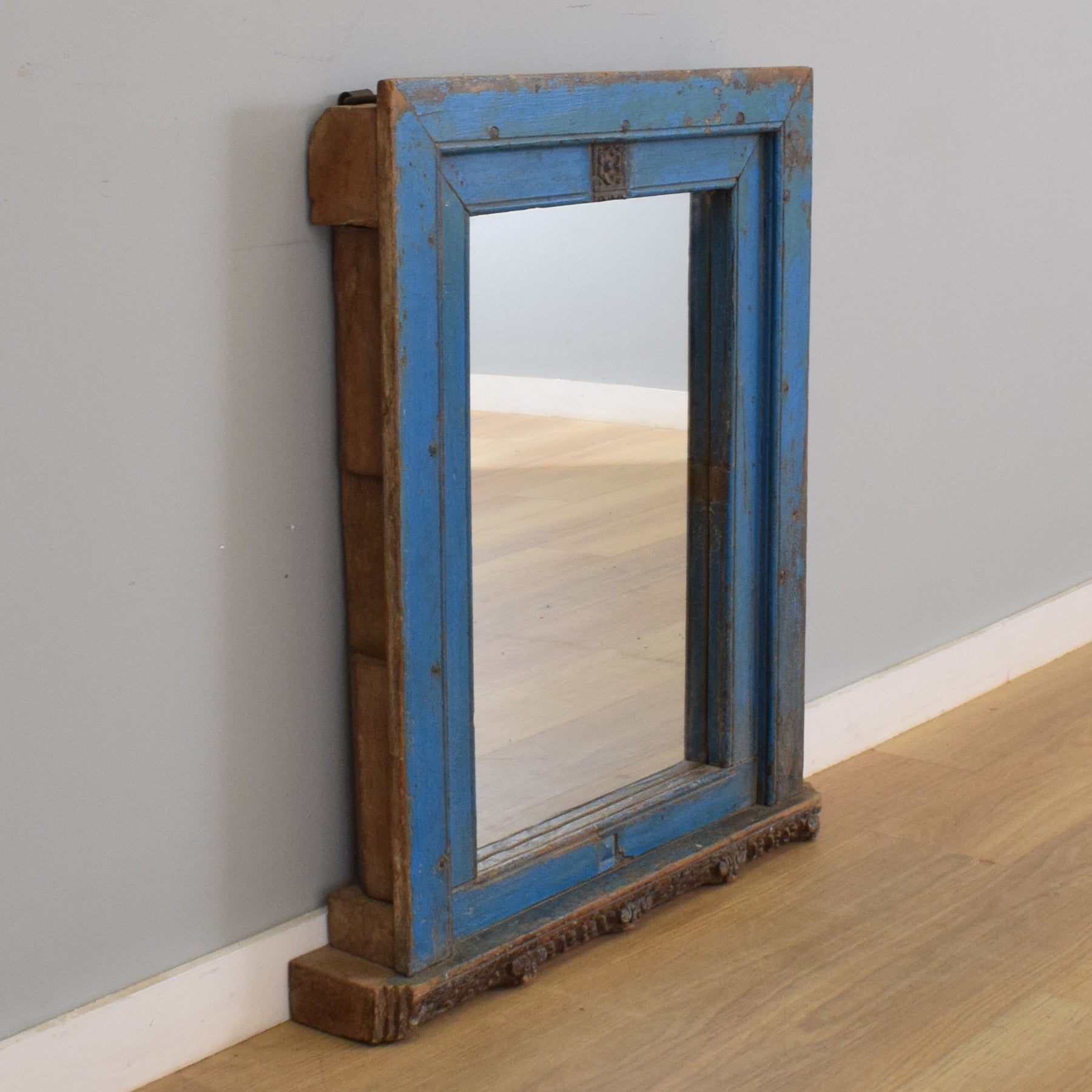 This substantial vintage mirror features a solid oak frame crafted from thick oak beams, with the aged wood showcasing a rich variety of texture and patina. The wide, moulded frame is painted in a distressed cobalt blue with a time-softened finish, while subtle carved details at the base and floral embellishments add a decorative touch without overwhelming the piece. Iron hanging loops at the back speak to its handmade origins and provide a secure mounting solution.