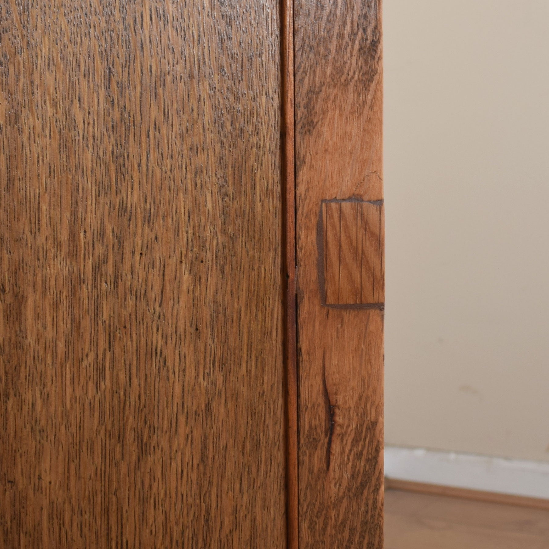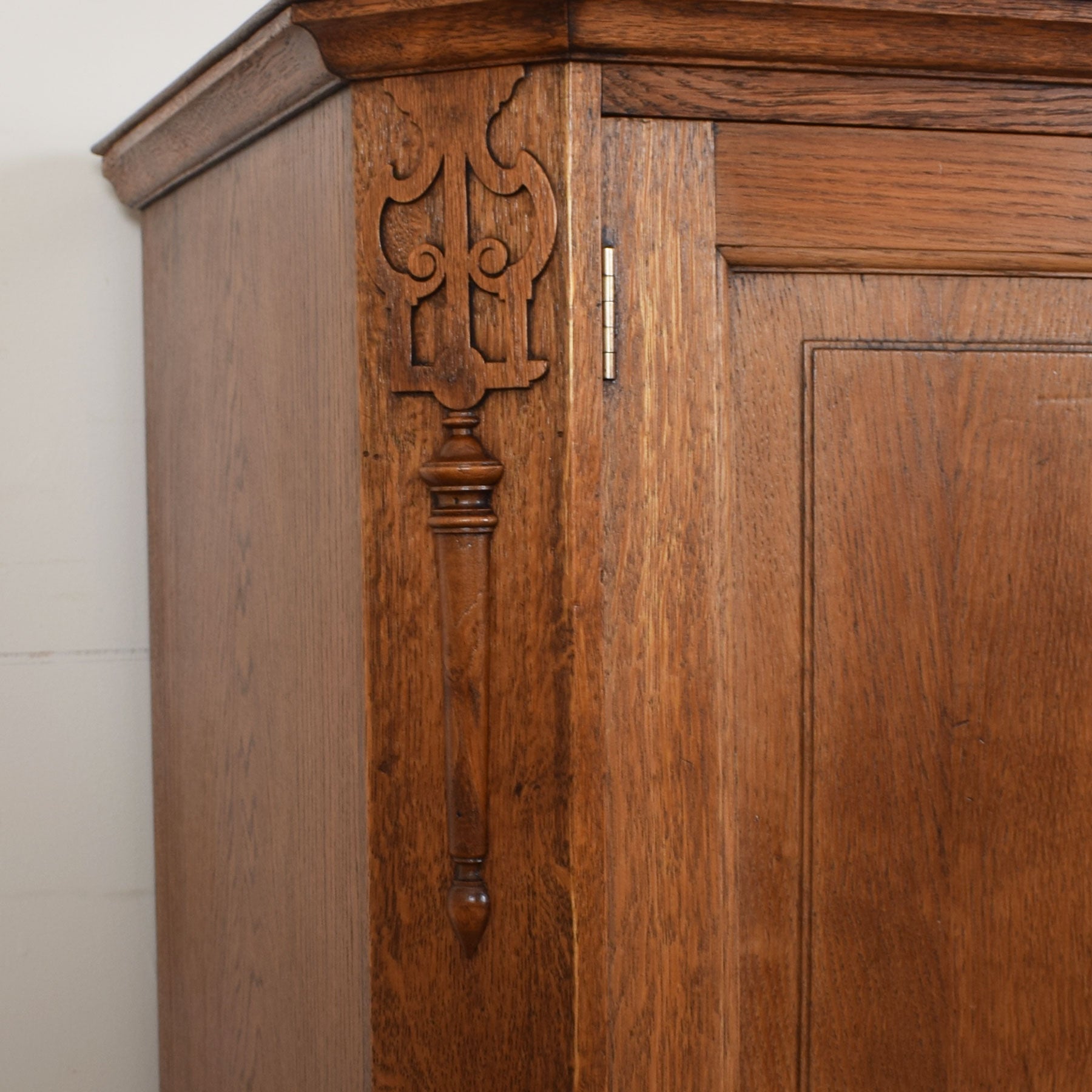 The locks on this sideboard have been substituted with solid oak blocks, and the voids in the wood have been filled using a medium oak filler. In their stead, some catches have been installed. As evidenced by the photographs, this piece features exquisite carvings that significantly enhance the sideboard's character. Furthermore, the original brass handles have been retained, which adds vibrancy to the sideboard.