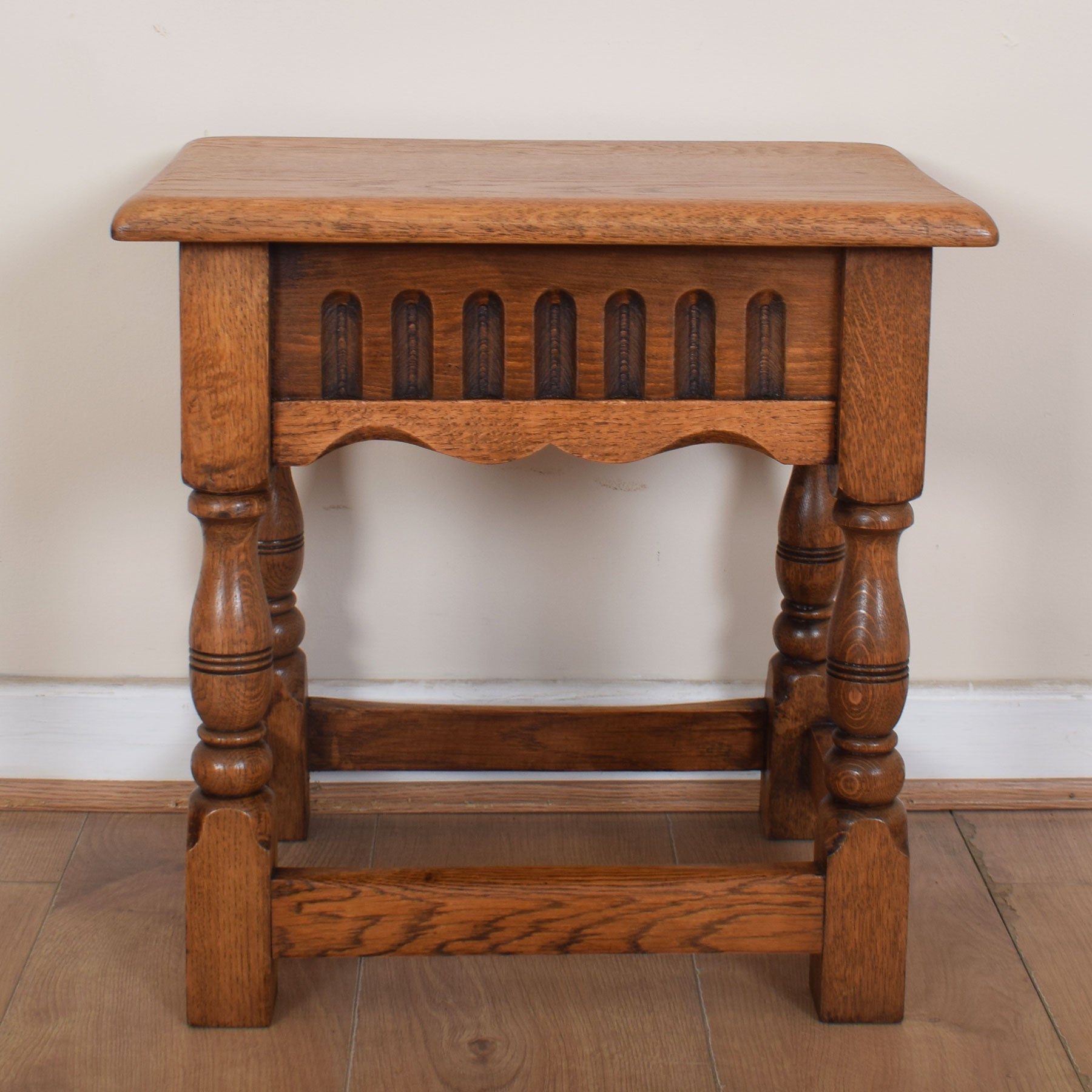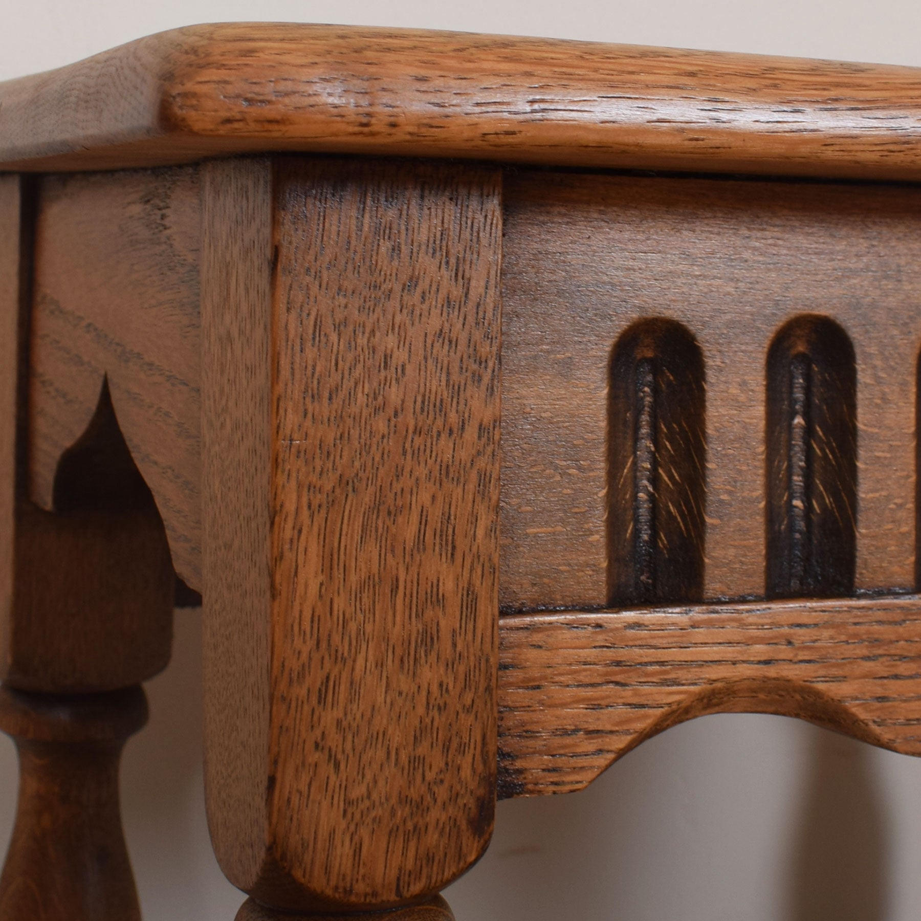 This robust oak table showcases a rectangular surface with softly rounded edges, upheld by turned legs and a lower stretcher for enhanced stability. A notable feature is the intricately carved apron located just below the tabletop, which contributes a hint of vintage charm. Its modest dimensions allow for easy placement in compact areas, while still providing an attractive visual appeal.