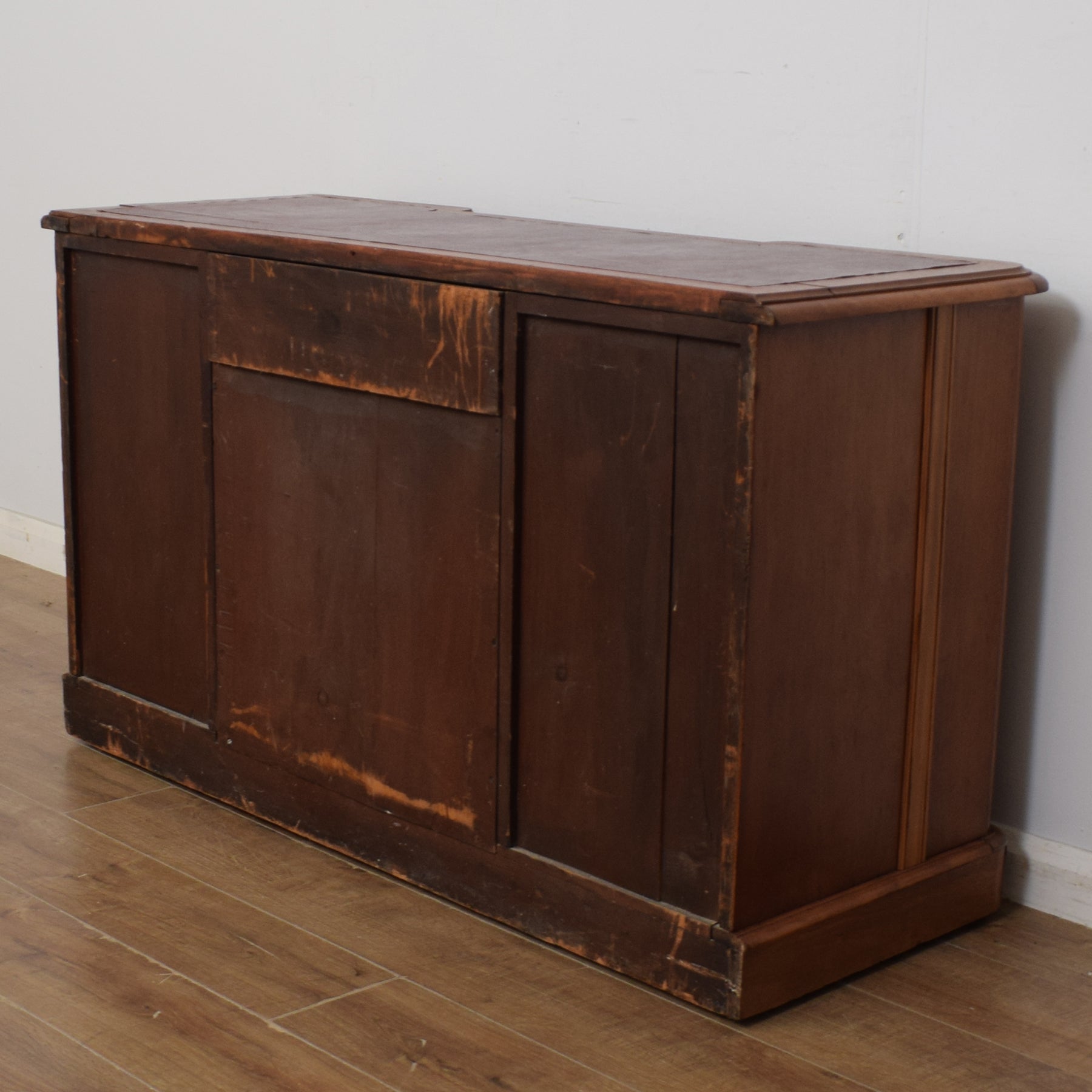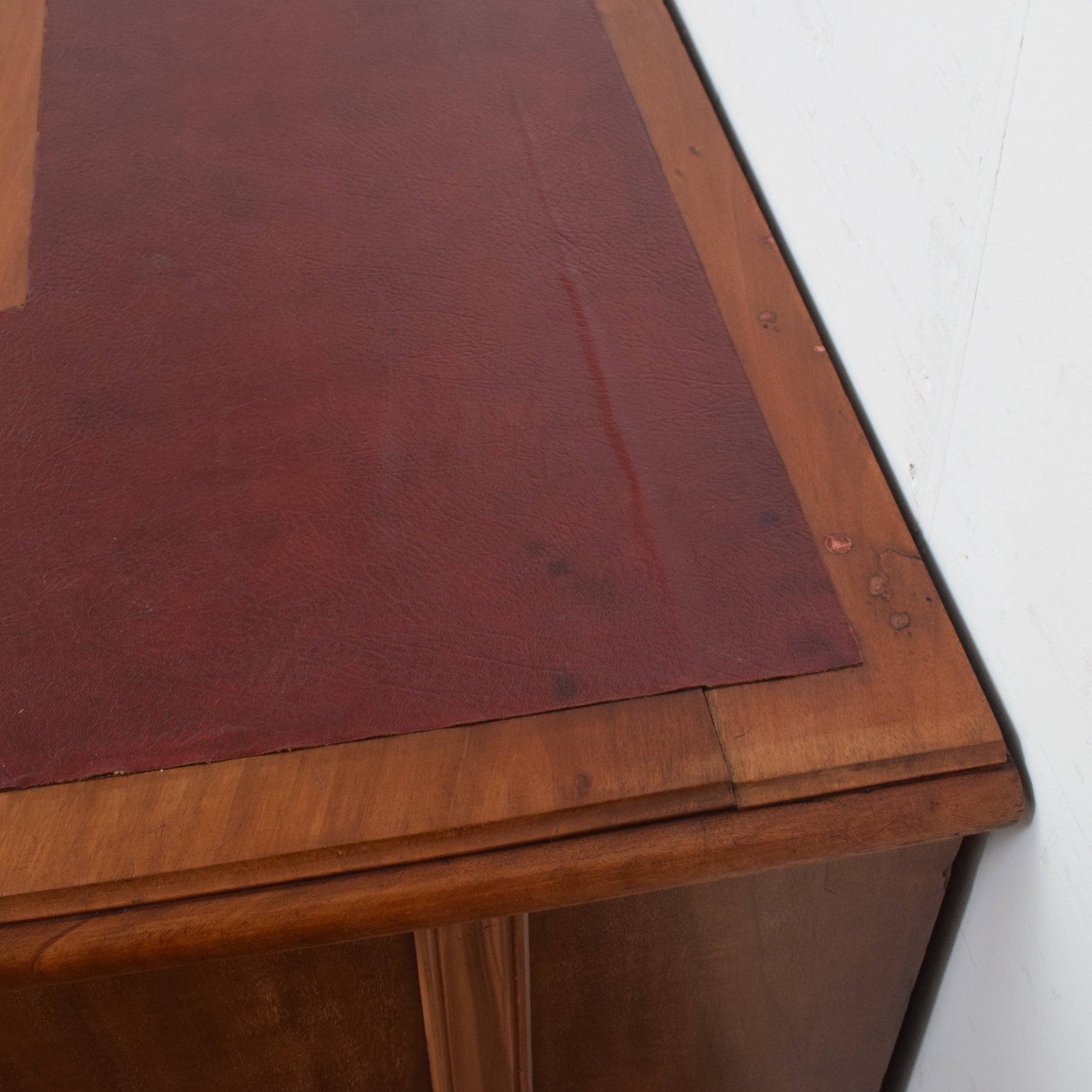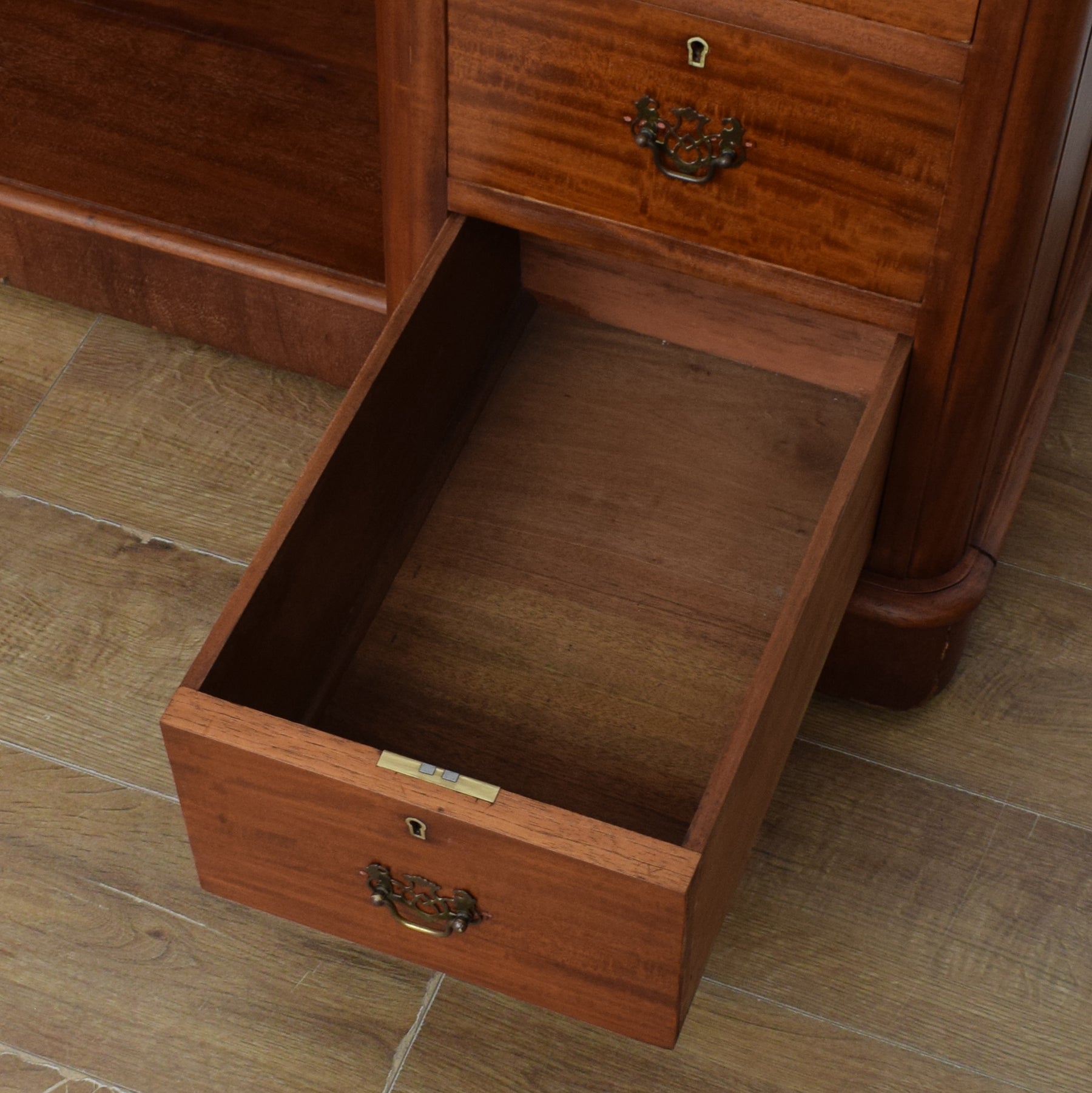 We have stripped the old finish from this desk before applying a coat of clear matt lacquer to bring out the beauty of the natural wood and provide an attractive and long-lasting finish. This desk is constructed predominantly from mahogany, with plywood used for the drawer bases.