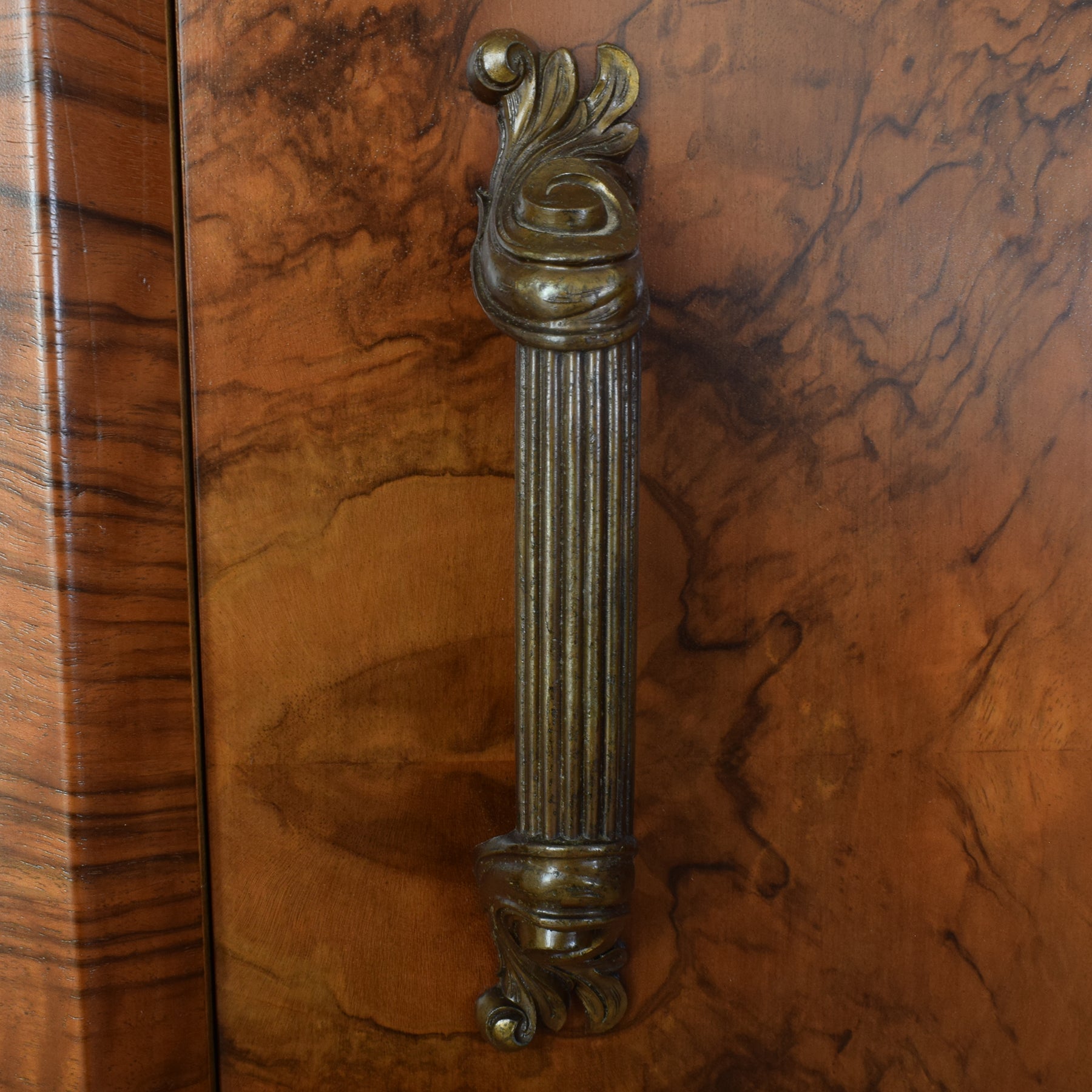 The previous darker finish has been carefully stripped away, and several coats of durable matte lacquer have been applied, enhancing the natural depth and warmth of the walnut grain. This item is made from compressed material covered with a walnut veneer, and the rear panel is constructed from plywood. A very small section of veneer is missing, which is visible in the photographs, though it does not detract from the overall presentation.