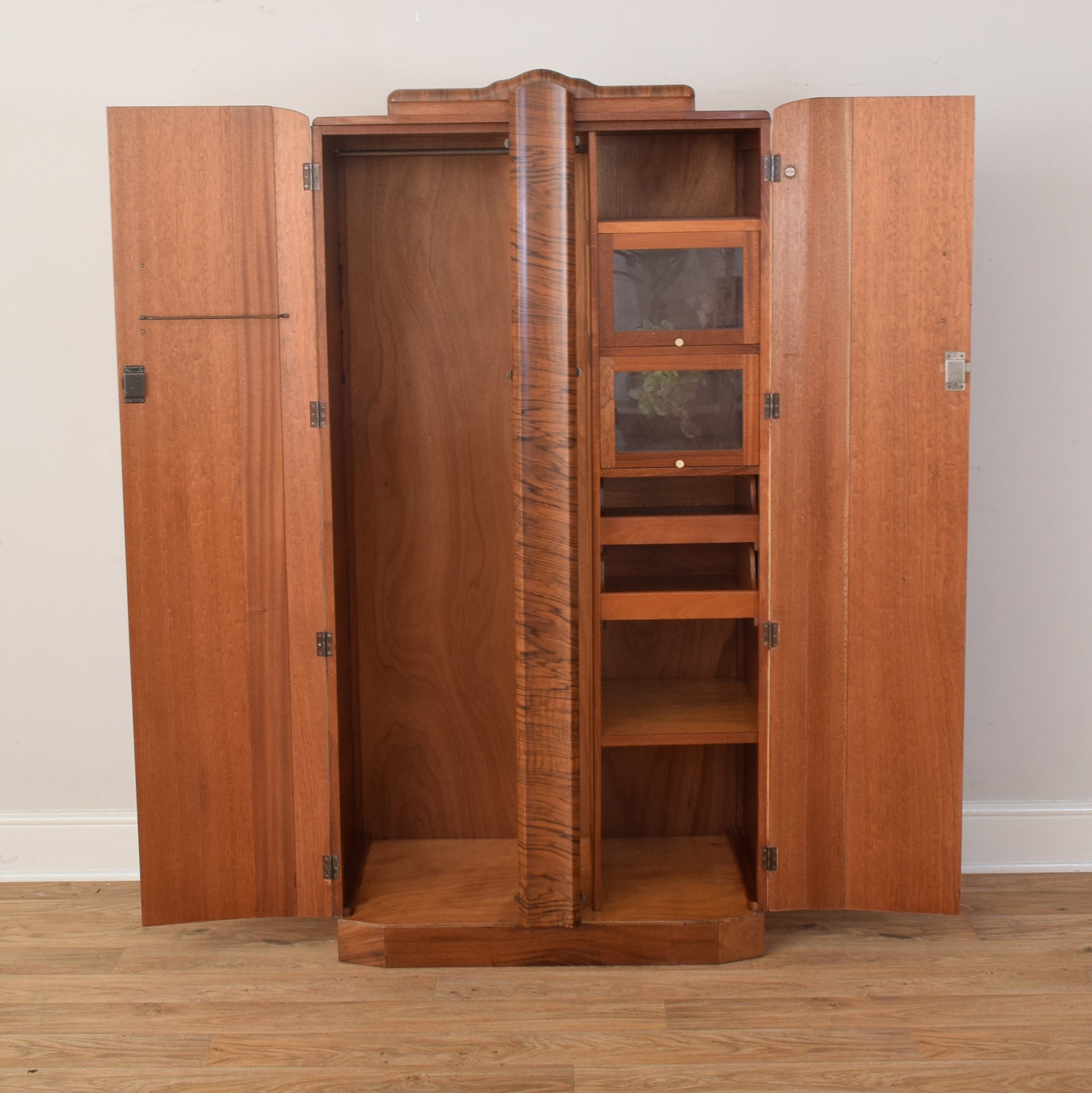 This wardrobe features beautifully patterned walnut veneer doors with a central curved section that adds character to the design. Inside, it offers a versatile storage layout — one side provides a full-length hanging area for clothing, while the other includes a combination of shelves and drawers. Two small glass-fronted compartments at the top are perfect for storing accessories or neatly folded garments, ensuring the interior is as elegant as it is practical.