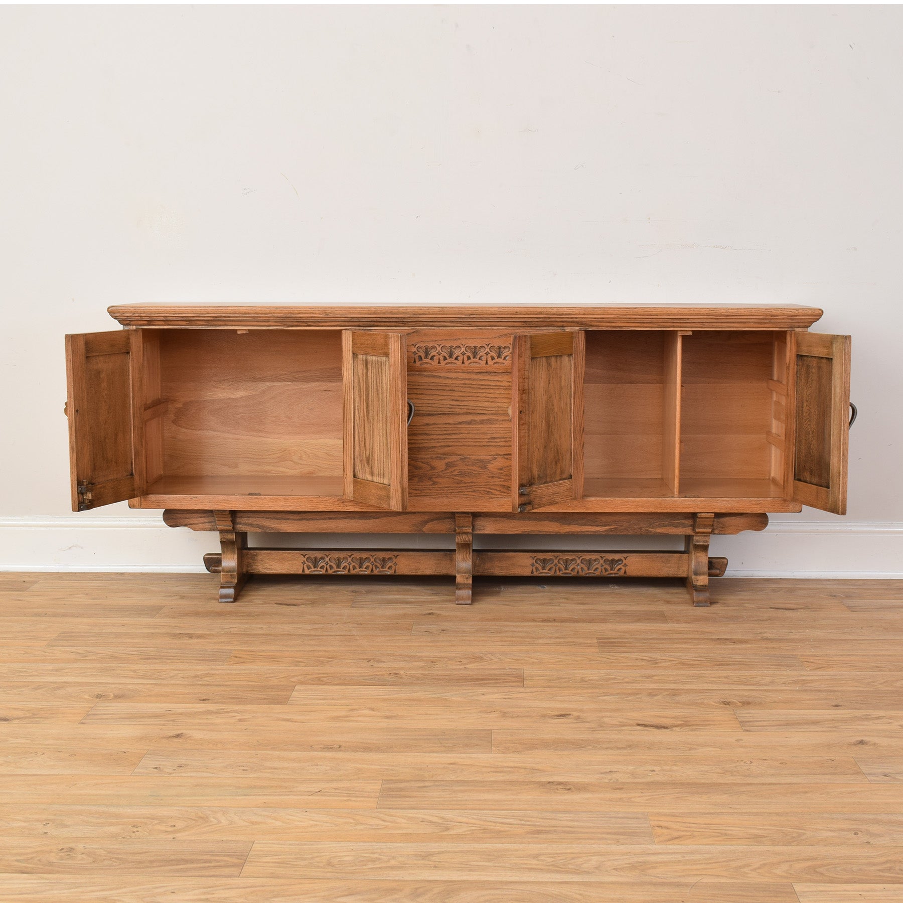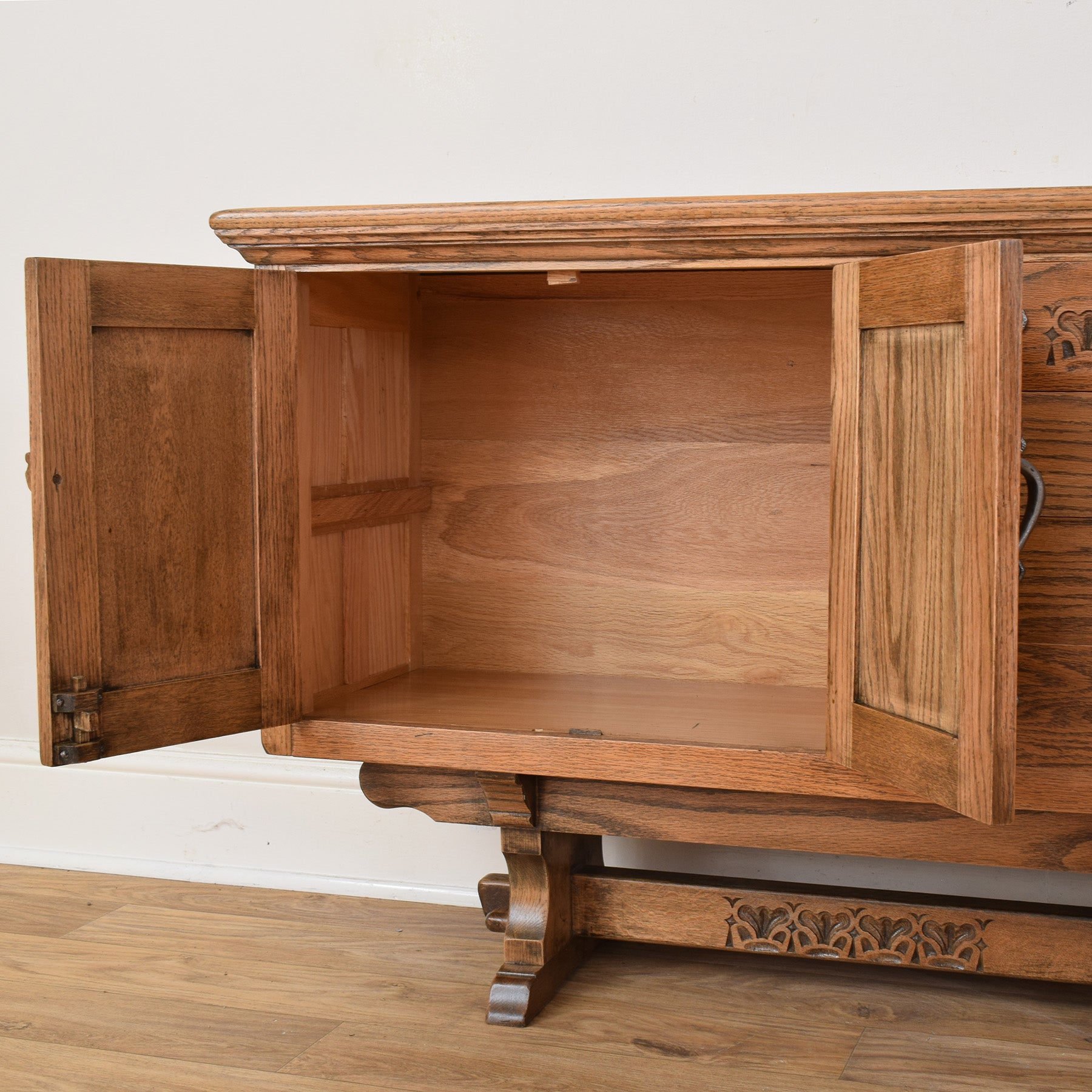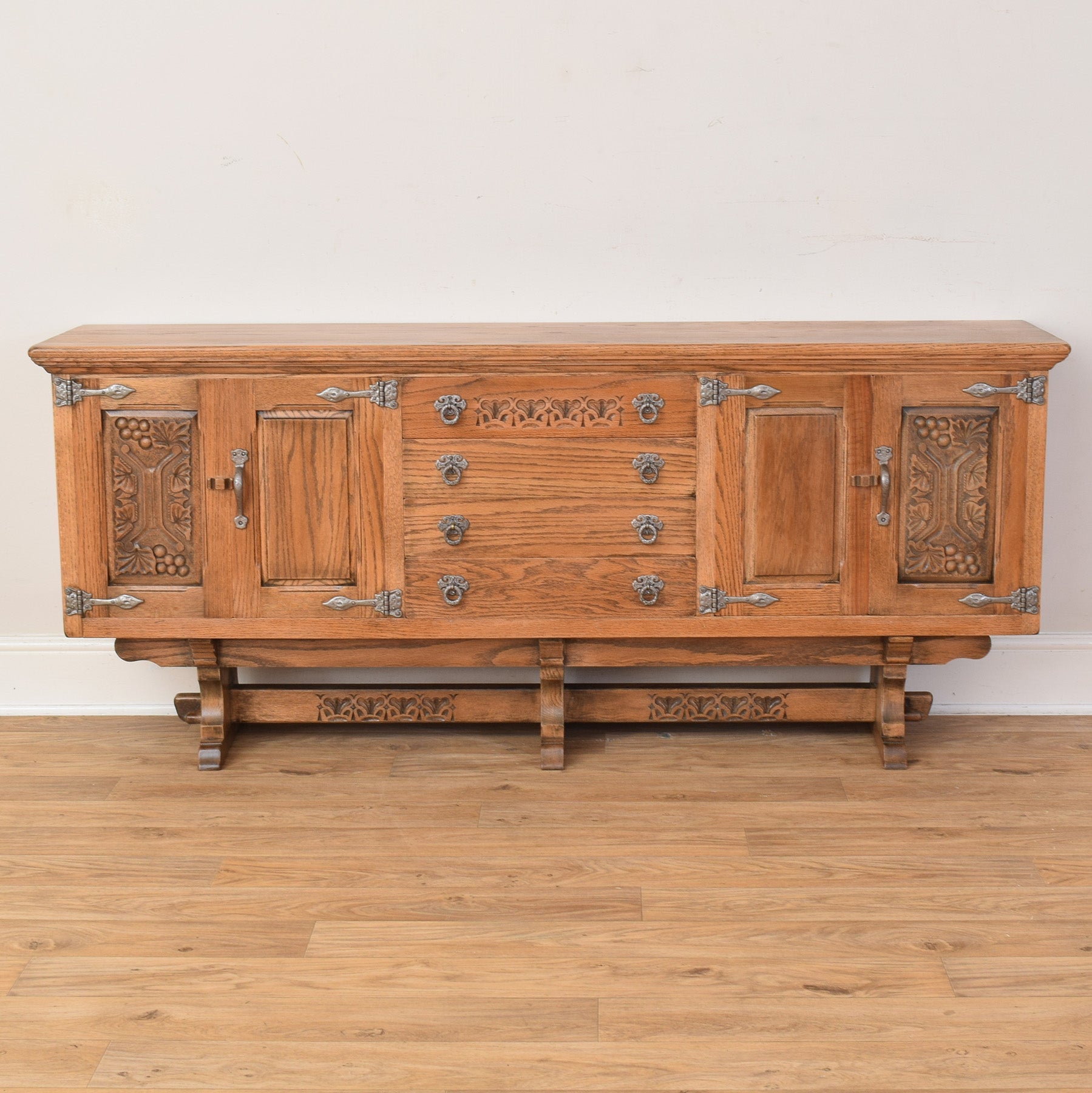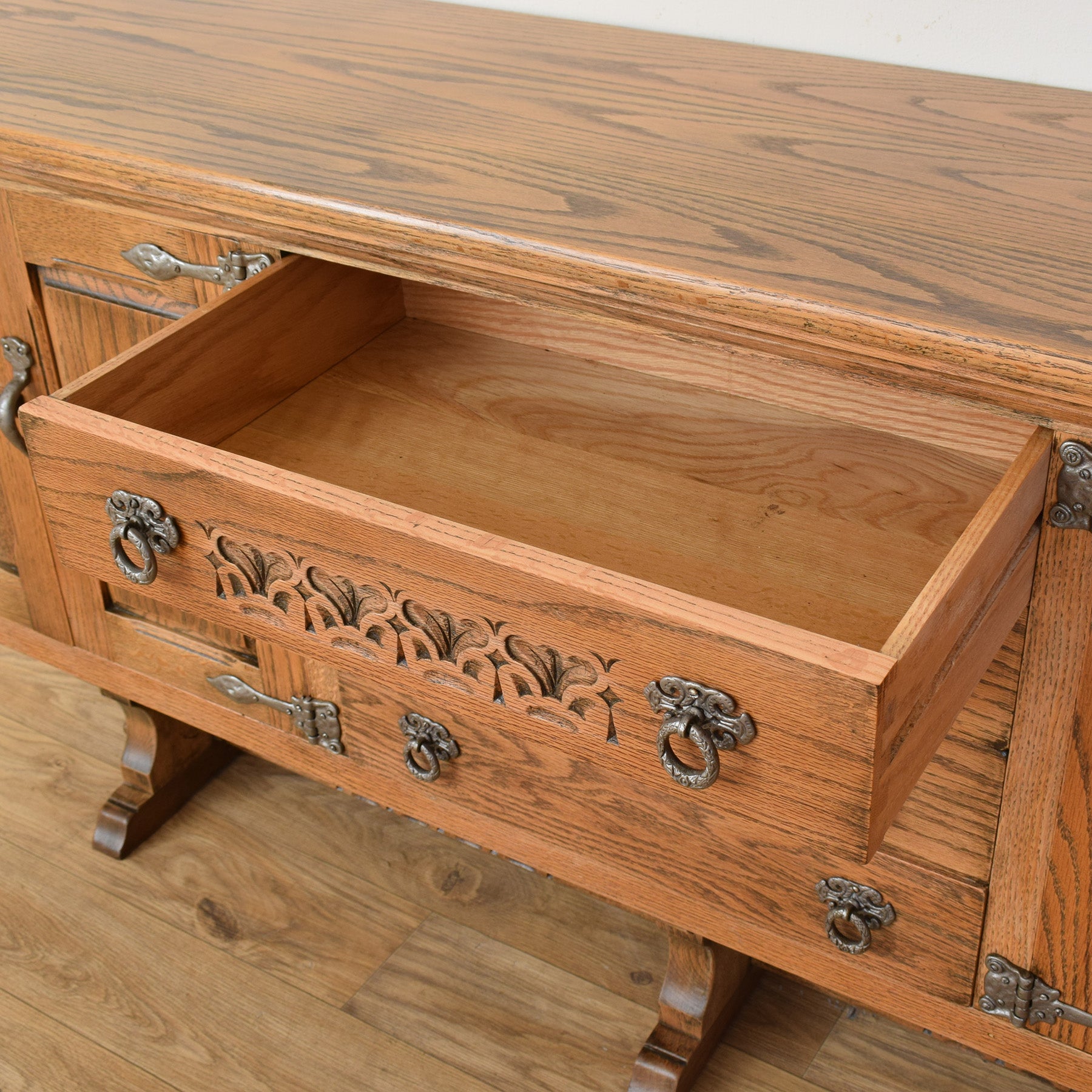 The sideboard features a well-considered layout with central drawers flanked by cupboard spaces on either side, each framed by decorative carved panels and finished with original-style metal hinges and handles. The warm oak tone highlights the natural grain, while the sturdy base gives the piece a grounded and substantial presence. The design is both functional and visually engaging, making it suitable for storing tableware, linens, or everyday household items.