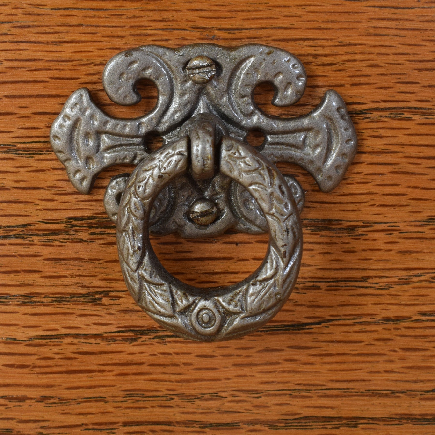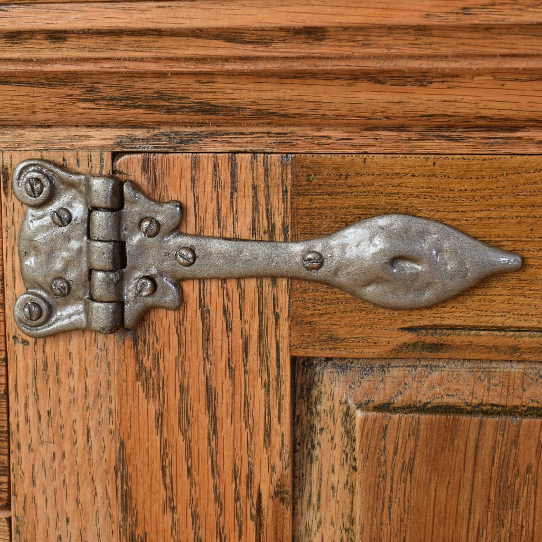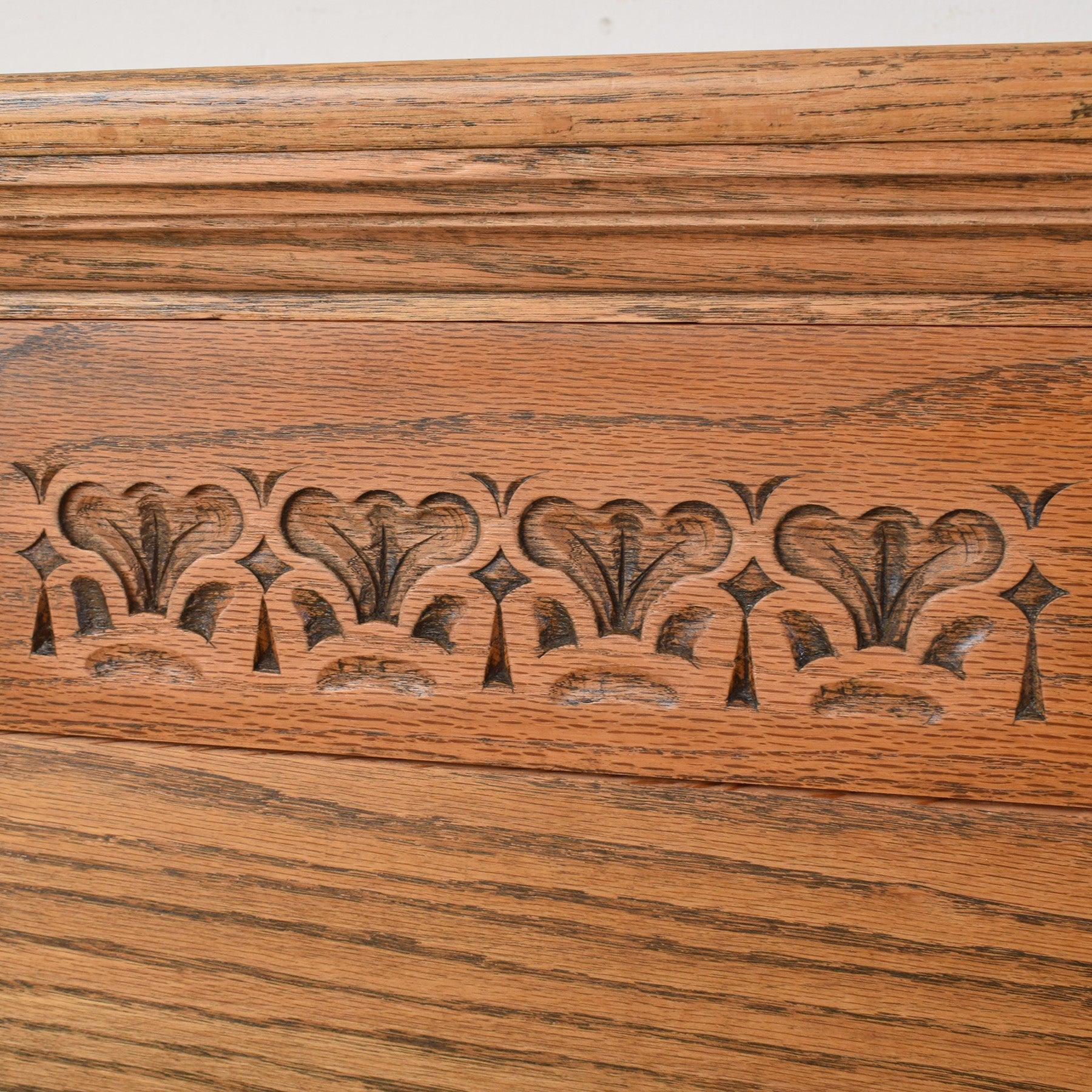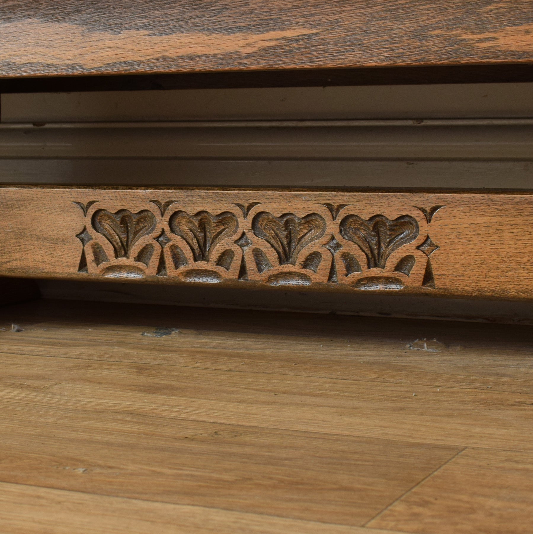 The sideboard features a well-considered layout with central drawers flanked by cupboard spaces on either side, each framed by decorative carved panels and finished with original-style metal hinges and handles. The warm oak tone highlights the natural grain, while the sturdy base gives the piece a grounded and substantial presence. The design is both functional and visually engaging, making it suitable for storing tableware, linens, or everyday household items.